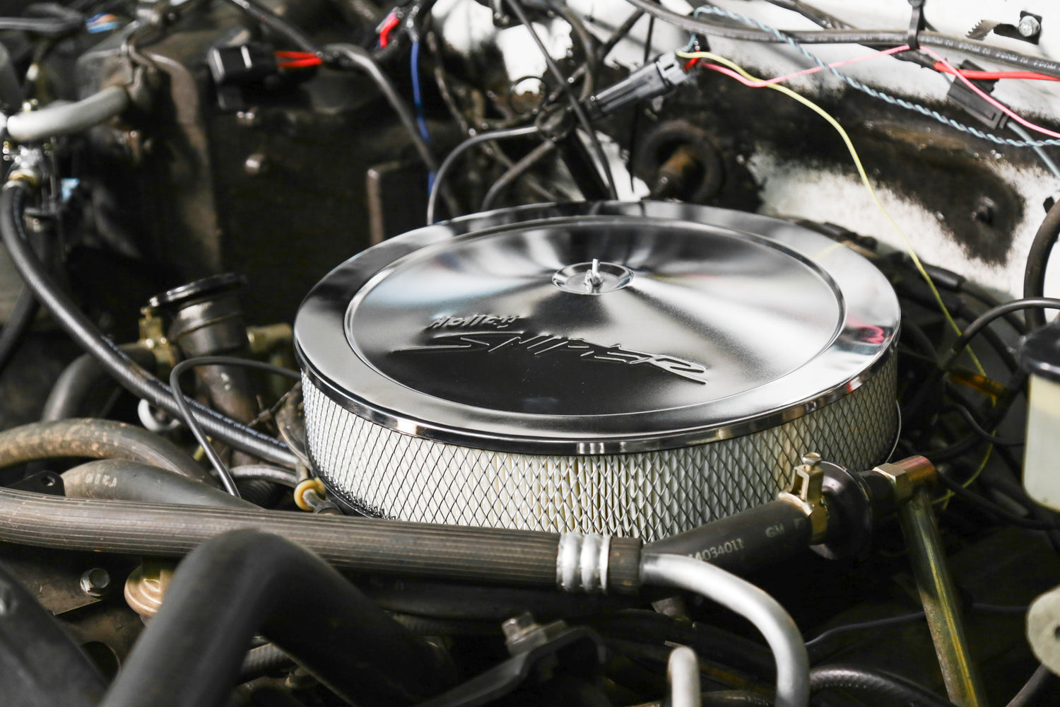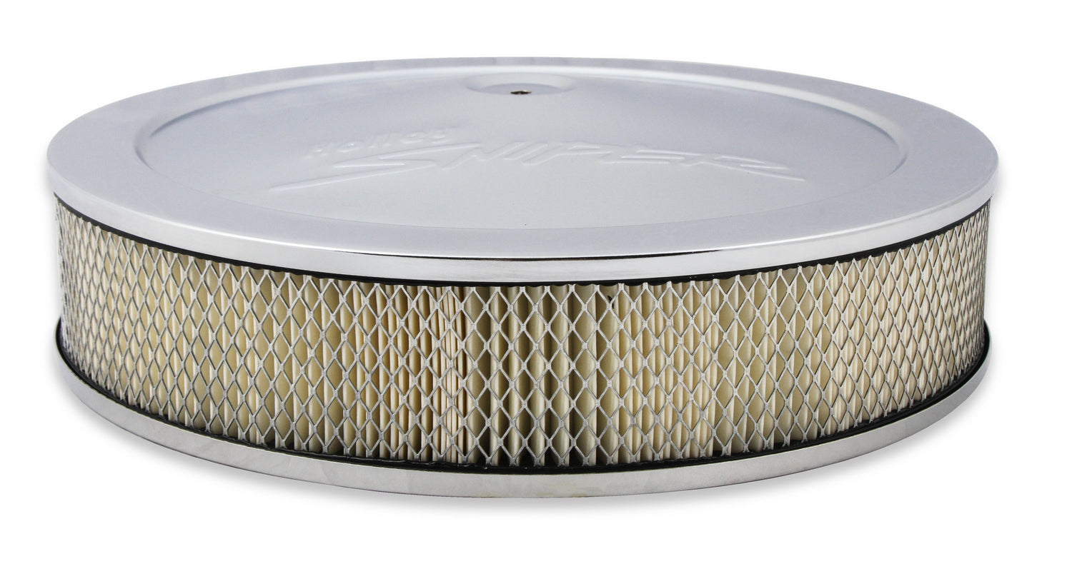 Complete your Sniper upgrade with our new 14" Sniper air cleaner assemblies. Each air cleaner assembly includes a stamped steel lid with an embossed Holley Sniper logo, a 1" drop base specifically designed for Sniper EFI applications, your choice of a 3" or 4" paper filter element, and all necessary mounting hardware. The included drop base fits all carbs and throttle bodies with a 5-1/8" neck - more specifically Sniper EFI 4150 throttle bodies with clearances for front mounted fuel fittings*, and Sniper EFI 2300 throttle bodies. Available in both black and chrome finishes to best match your SniperEFI unit.