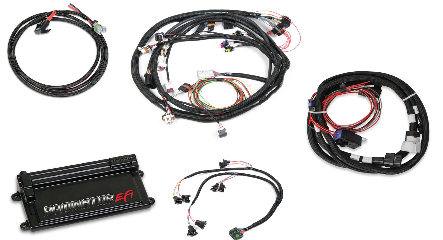 - Kits include the following: Dominator ECU, USB cable, ECU Power Harness, Engine Main Harness, EV1 Injector Harness, Bosch Wideband, ECU mounting hardware