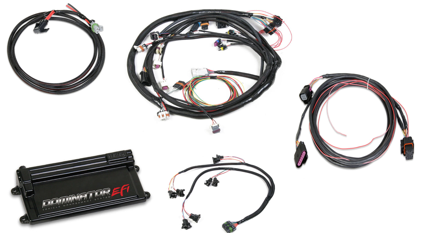 - Kits include the following: Dominator ECU, USB cable, ECU Power Harness, Engine Main Harness, EV1 Injector Harness, Bosch Wideband, ECU mounting hardware