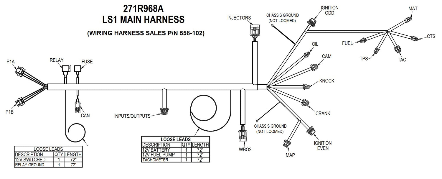 This harness is designed for LS1/6 Engines, from 1997-2004. This harness interfaces with 24x Crank and 1x Cam sensors.