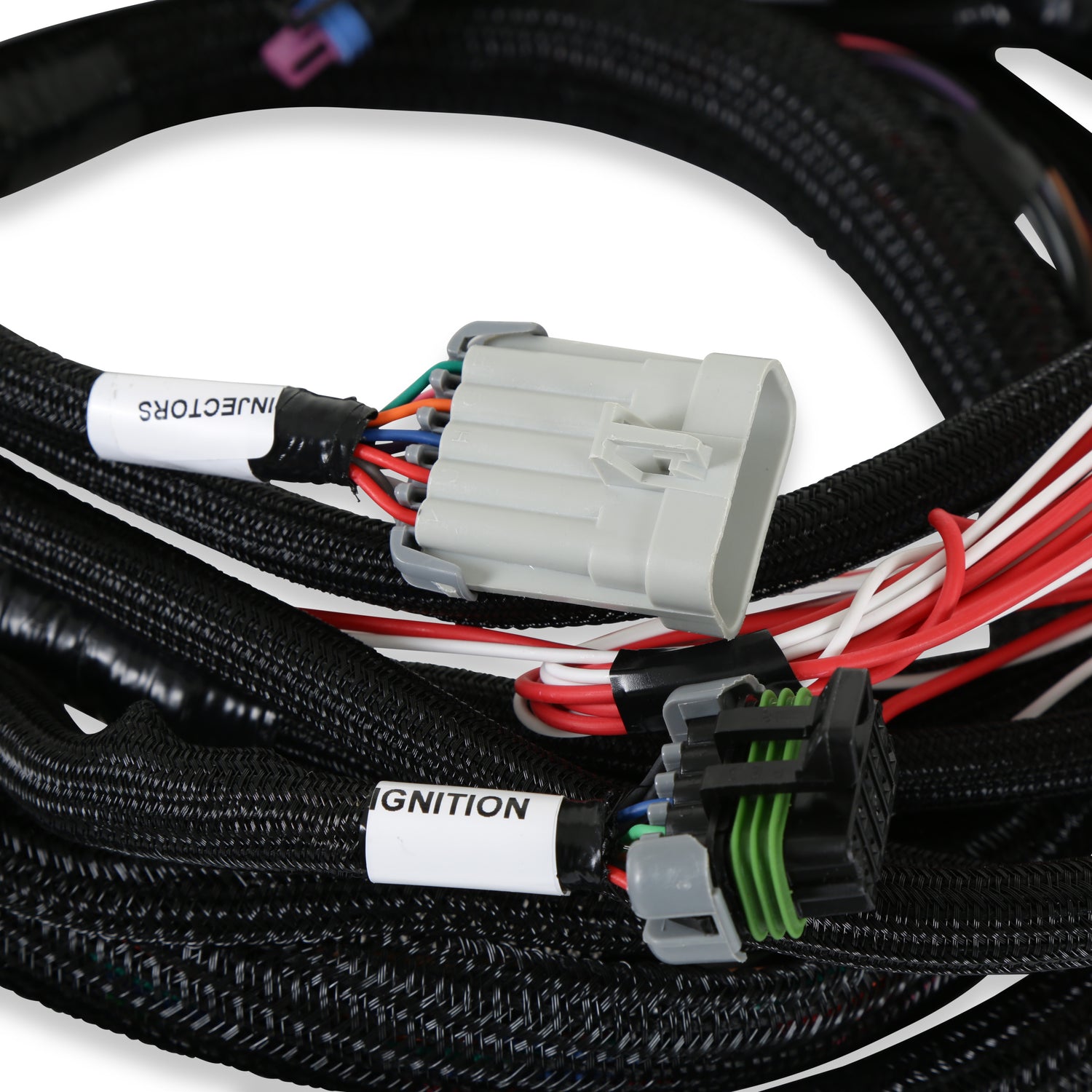 This harness is for fuel injected small block ford engines, such as 5.0L, or 5.8L Windsor powerplants. Plug and play ignition capability with Dual Sync and HyperSpark Distributors, ignition adapter 558-305 is required for applications with a TFI distributor. The 5.0L Ford main harness is pre-terminated with Ford PWM IAC connector, for the OEM PWM - idle air control motor commonly found on late 80s and early 90s engines. Compatible with Holley EFI Dominator, HP, and Terminator X and X Max ECUs.