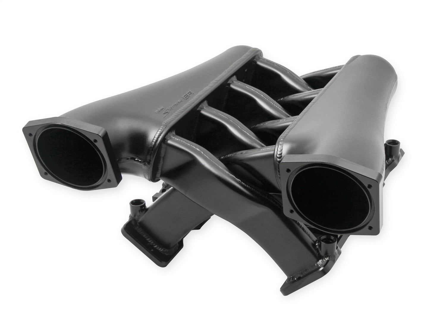 Holley continues to push the envelope of intake design with its latest offering. The unique look of this intake will surely stand out from the crowd! Our latest release of fabricated "Dual Plenum" intake manifolds for GM LS1/2/6 and LS3/L92 engines. This unique design of utilizing two plenums solves two common problems experienced with many intakes increased airflow and even dispersion of air to intake ports. The use of one tapered plenum to accommodate one bank of cylinders accomplishes both problems. The entire volume of incoming air is distributed to only four cylinders and the tapered shape of the plenum help increased air velocity directed to each of the intake runner ports. Our dual plenum design features extremely long 12-3/4 in. runners to develop low-end torque making this intake an ideal "street" intake. These intake are finished in our familiar silver and black anodized finishes for durability and good looks. Our 3/8 in. fuel rail kit include a laser engrave Sniper logo and are capable of supporting 750+ horsepower.