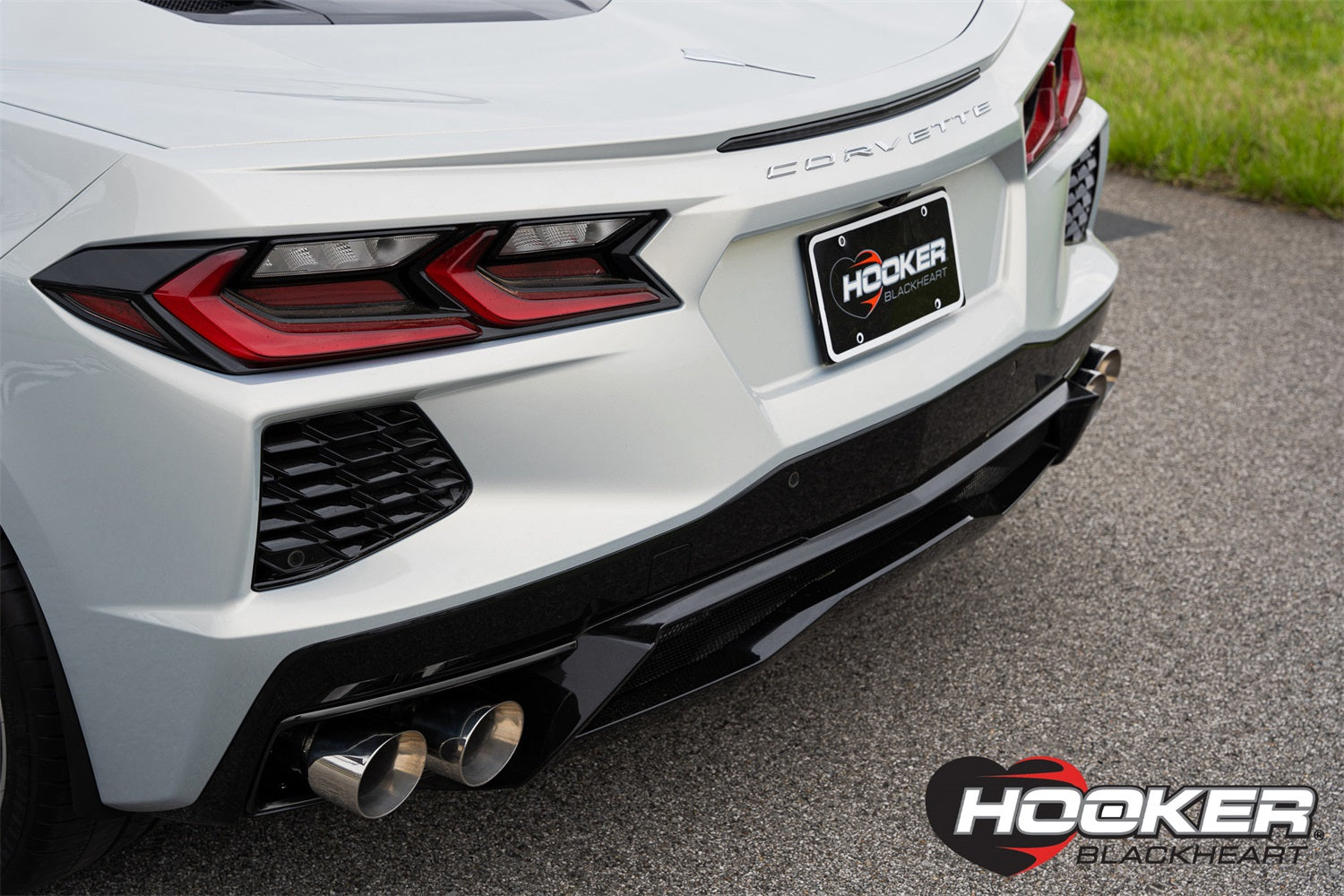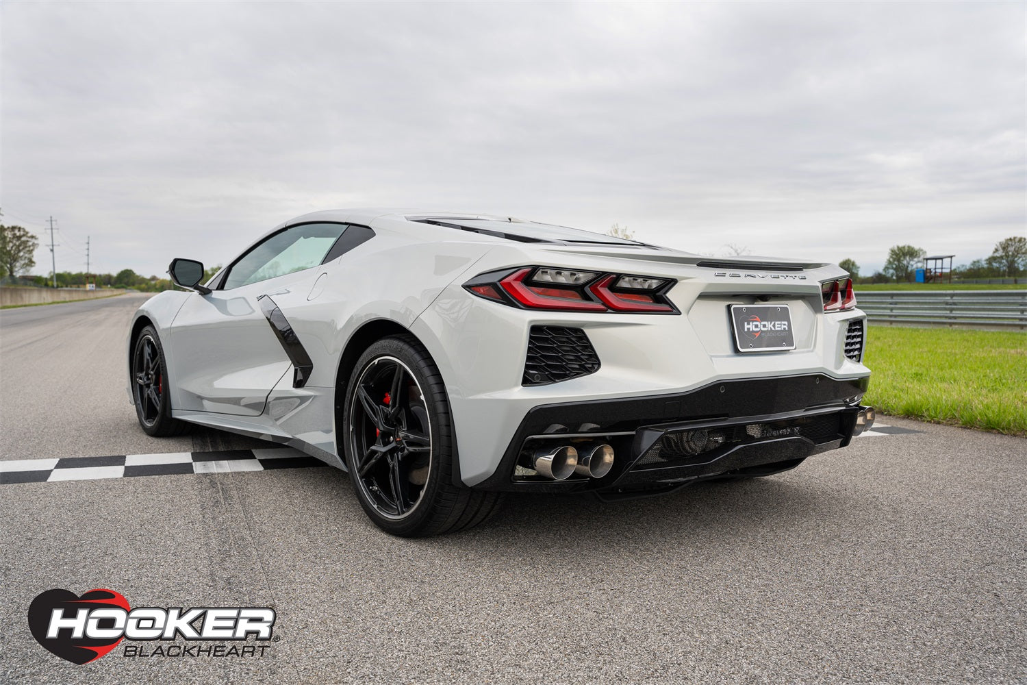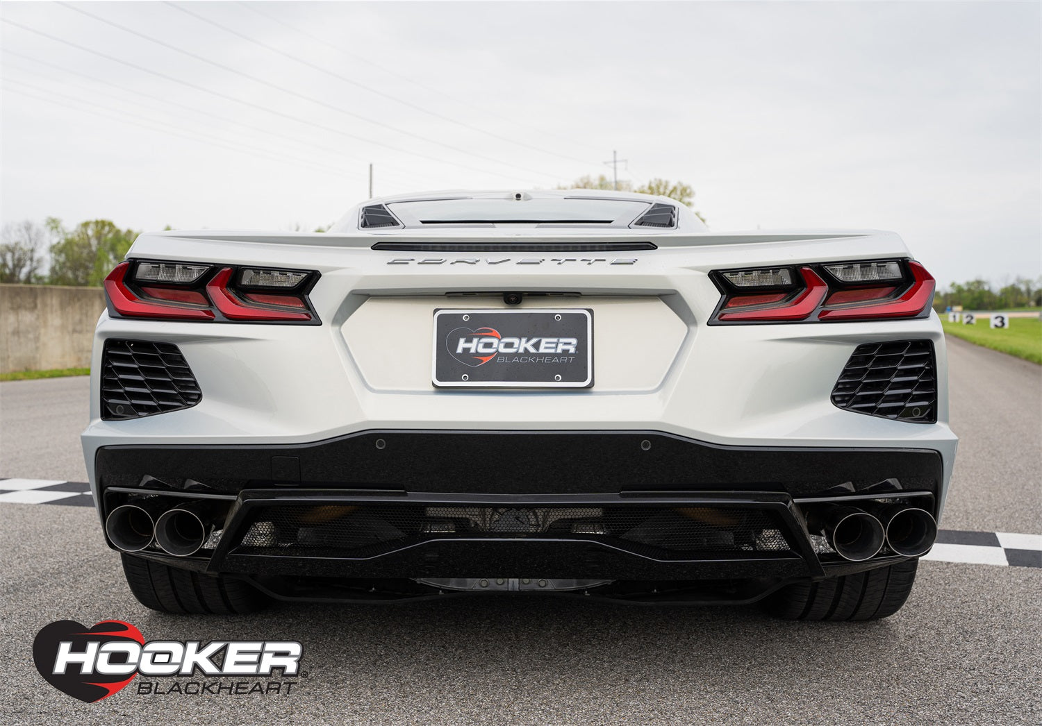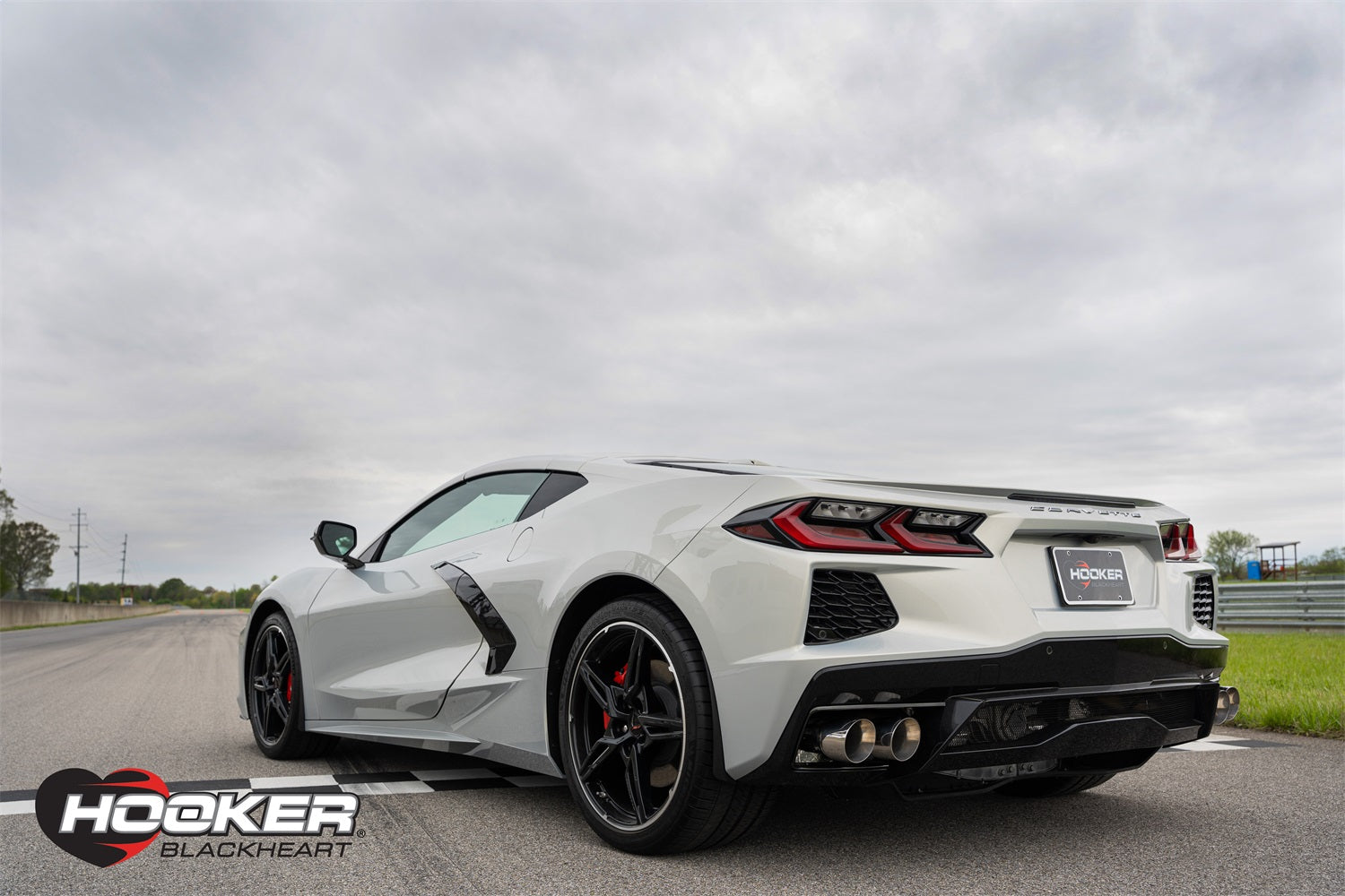If youre looking to open up the sound of your Stingray, these Hooker BlackHeart 304 stainless steel Cat-Back exhaust systems will make your 2020-2023 C8 Corvette sound like the supercar it is. The non-muffled straight through kit design will not only give your car a deep aggressive rumble, but it will also reduce the weight of the overall exhaust system. Also, included in these systems are AFM valve simulators that reuse the factory valve actuators to eliminate faulty check engine lights. While designed for C8s without the factory NPP dual mode exhaust option, this system can be used with NPP-equipped Stingrays if NPP simulators are used (sold separately). The systems include mandrel bent 3.00-inch tubing to maximize the exhaust flow, and are finished off with four 4.00-inch double walled polished or black stainless steel tips that have the Hooker BlackHeart logo laser etched into them for great looks. These two-piece exhaust systems reduce the overall installation complexity by not having to align both sides at the same time. Hardware that utilize the factory mounting points are included. Backed by Hooker BlackHearts limited lifetime warranty.