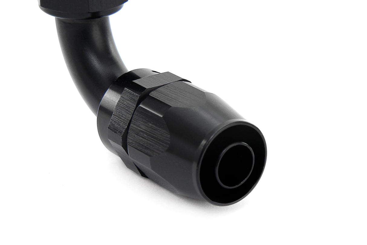 HPS AN-10 45 degree compression style reusable hose end fitting for rubber flex hose, 37 deg flare, 6061 aluminum, durable black anodizing for corrosion resistance.