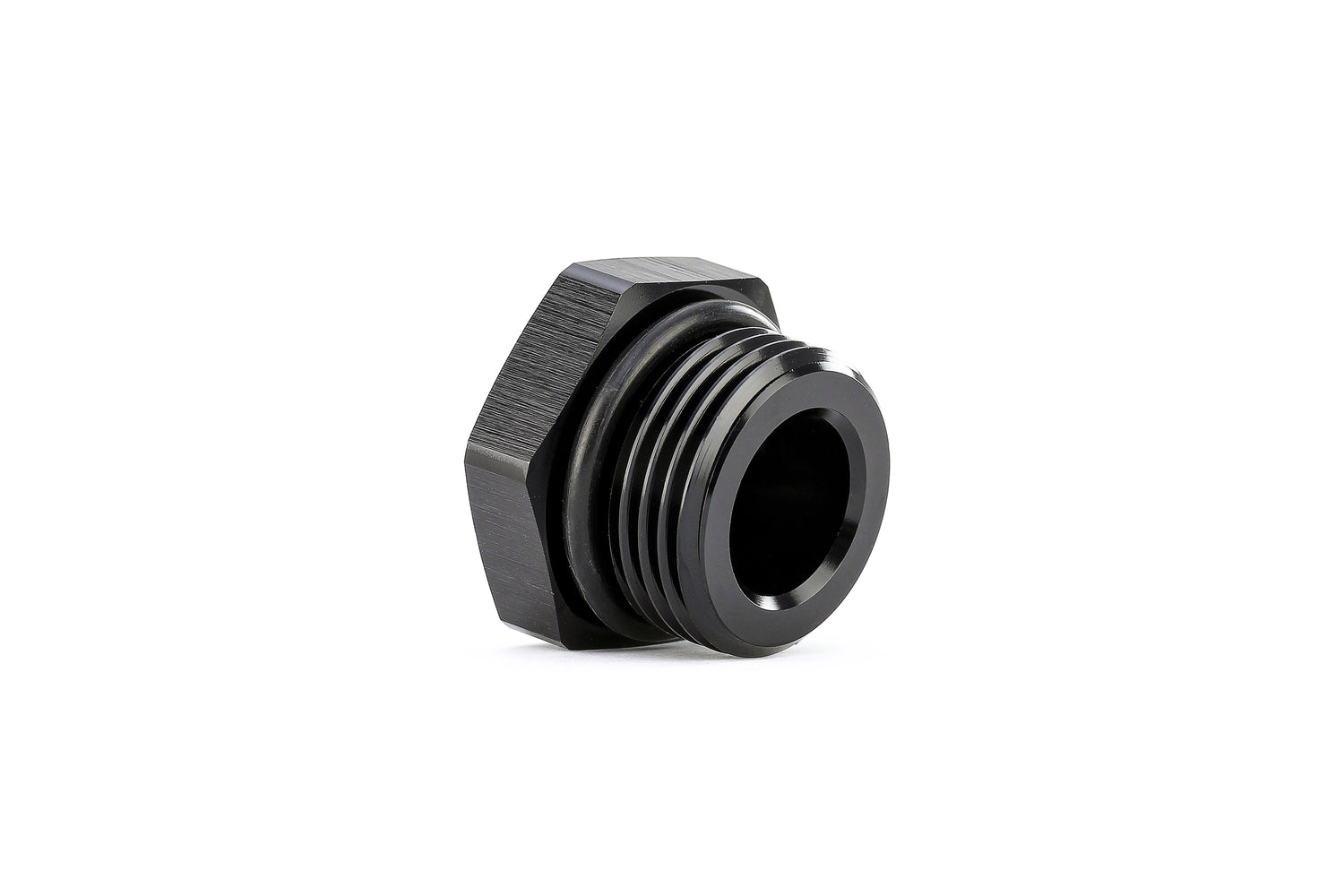 Aluminum O-ring boss plug for AN-12 straight thread, machined from 6061 aluminum, durable black anodizing to provide excellent corrosion and abrasion resistance.