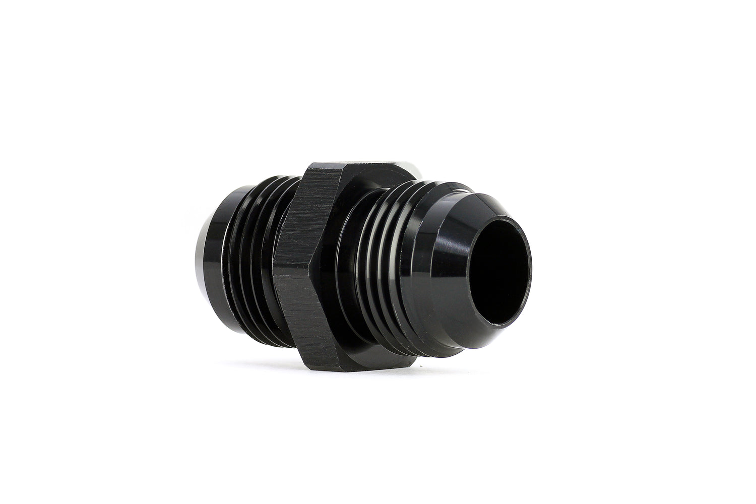 Male AN-10 Flare on both sides, machined from 6061 aluminum, durable black anodizing for corrosion resistance.
