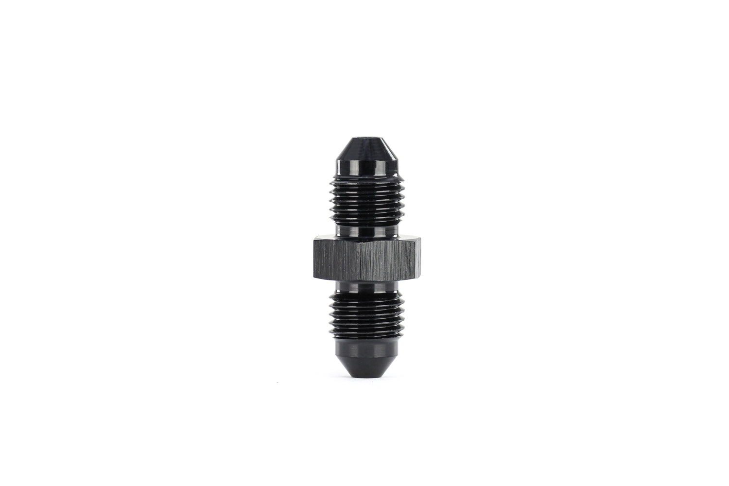 Male AN-3 Flare on both sides, machined from 6061 aluminum, durable black anodizing for corrosion resistance.
