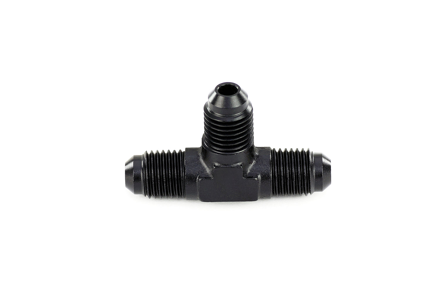 HPS Tee Adapter Fittings connect 3 hoses or tubes with 37 degree flares to create a split or a merge. Compatible with water, coolant, air, oil, and most fuels. Type II anodized black to provide excellent abrasion and corrosion resistance.
