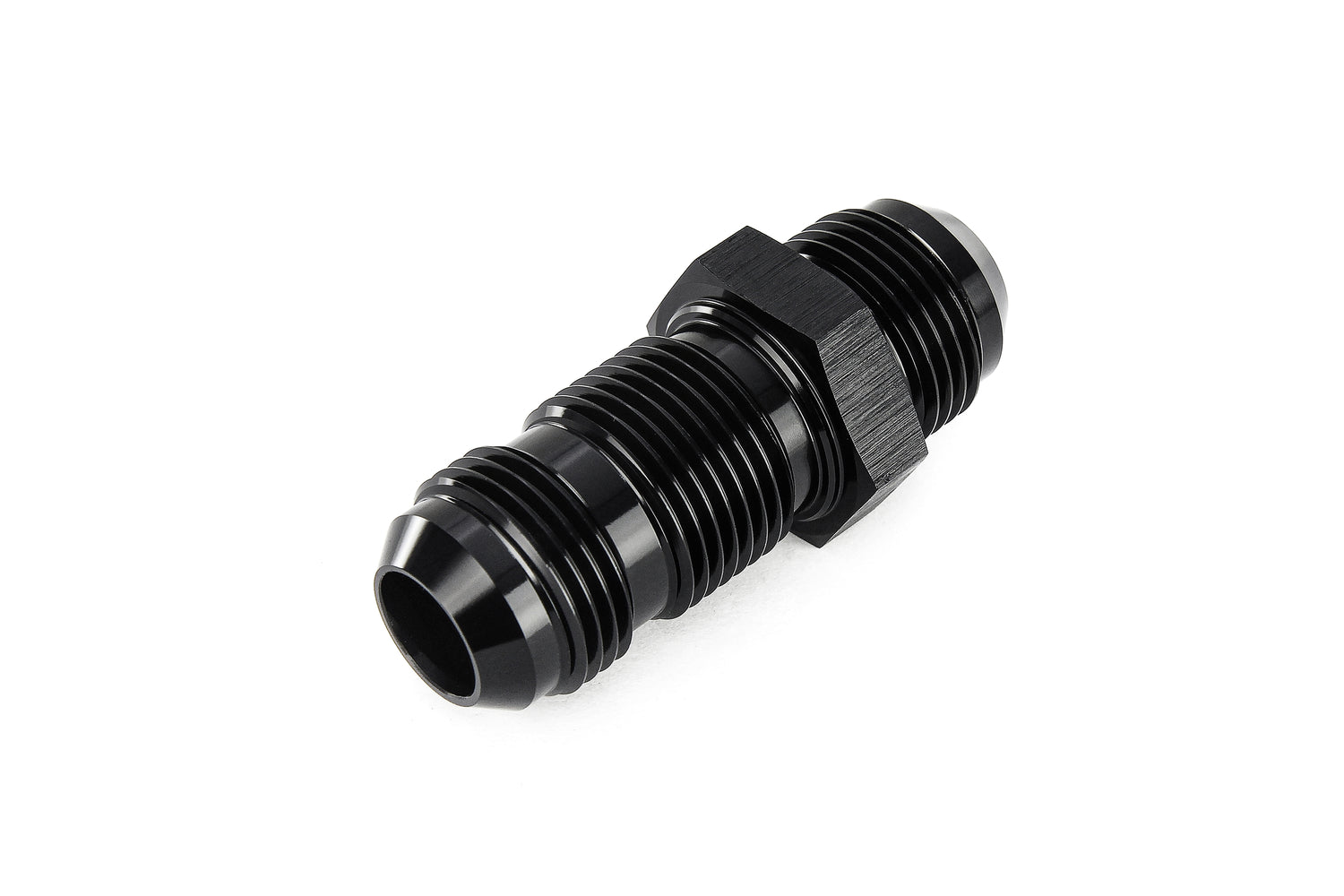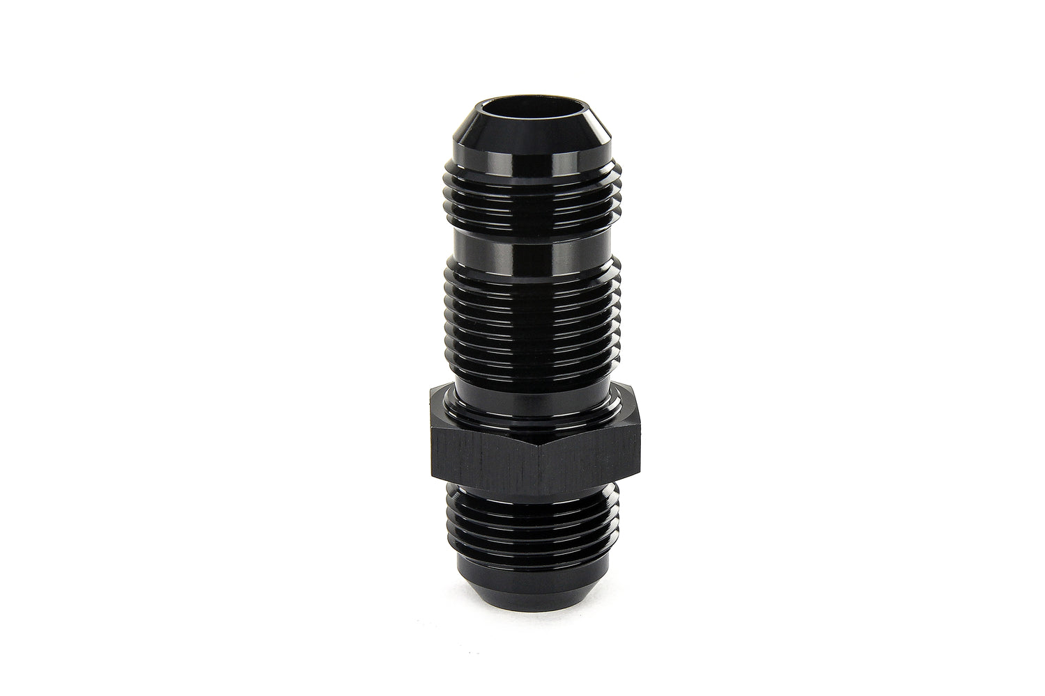 Male AN-10 Flare on both sides, can be mounted onto firewall or any bulkhead panel, machined from 6061 aluminum, durable black anodizing for corrosion resistance.