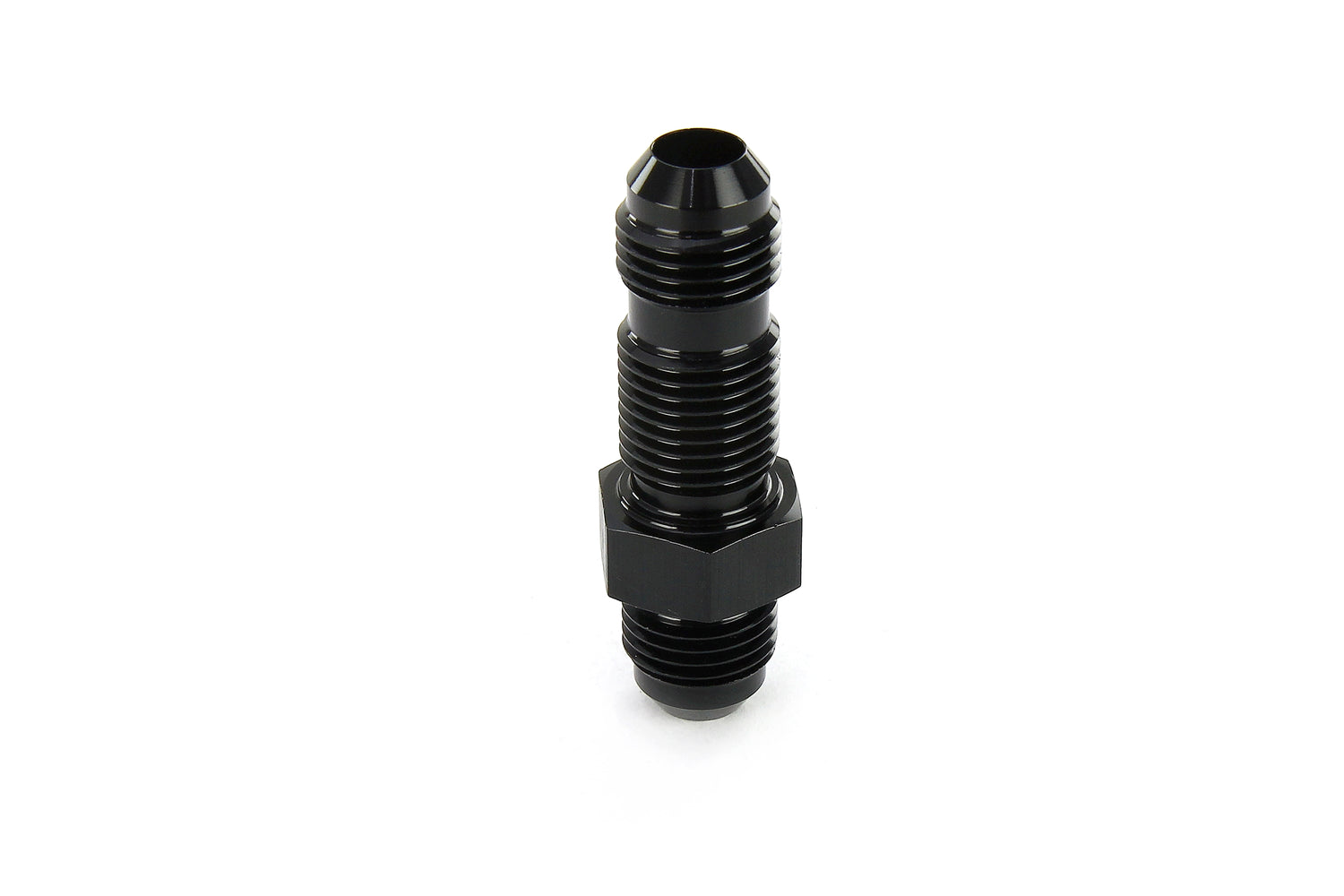 Male AN-8 Flare on both sides, can be mounted onto firewall or any bulkhead panel, machined from 6061 aluminum, durable black anodizing for corrosion resistance.