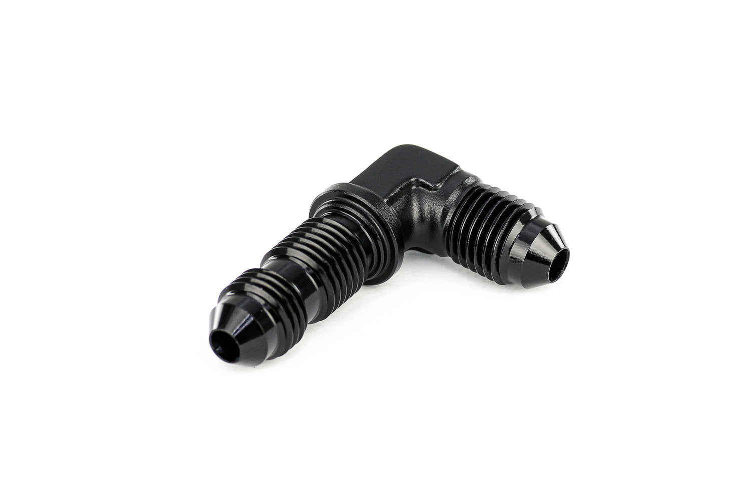 Male AN-3 Flare on both sides with 90 degree elbow, can be mounted onto firewall or any bulkhead panel, machined from 6061 aluminum, durable black anodizing for corrosion resistance.
