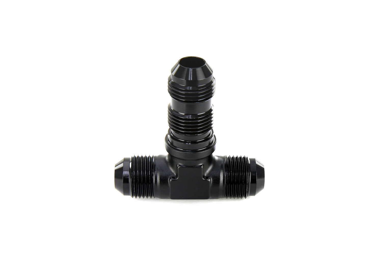 AN-6 bulkhead tee adapter, can be mounted onto firewall or any bulkhead panel, machined from 6061 aluminum, durable black anodizing for corrosion resistance.
