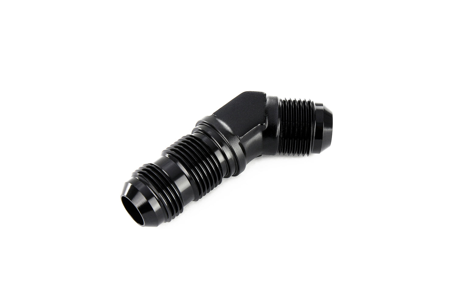 Male AN-10 Flare on both sides with 45 degree elbow, can be mounted onto firewall or any bulkhead panel, machined from 6061 aluminum, durable black anodizing for corrosion resistance.