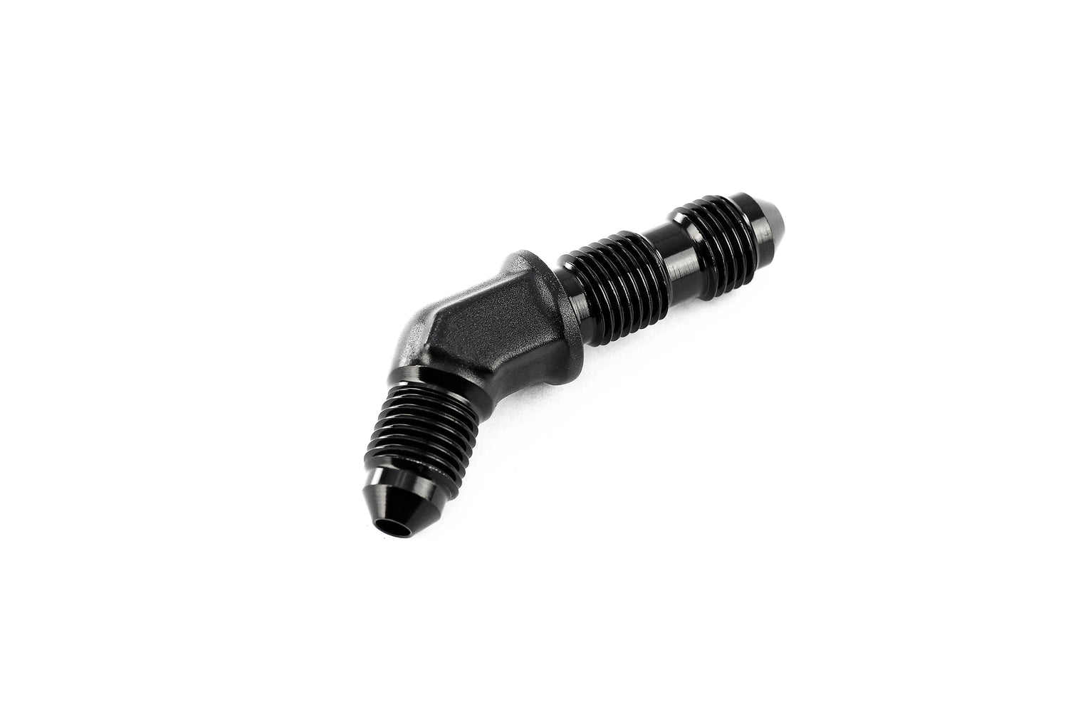 Male AN-4 Flare on both sides with 45 degree elbow, can be mounted onto firewall or any bulkhead panel, machined from 6061 aluminum, durable black anodizing for corrosion resistance.