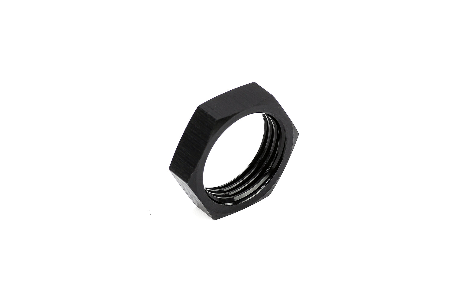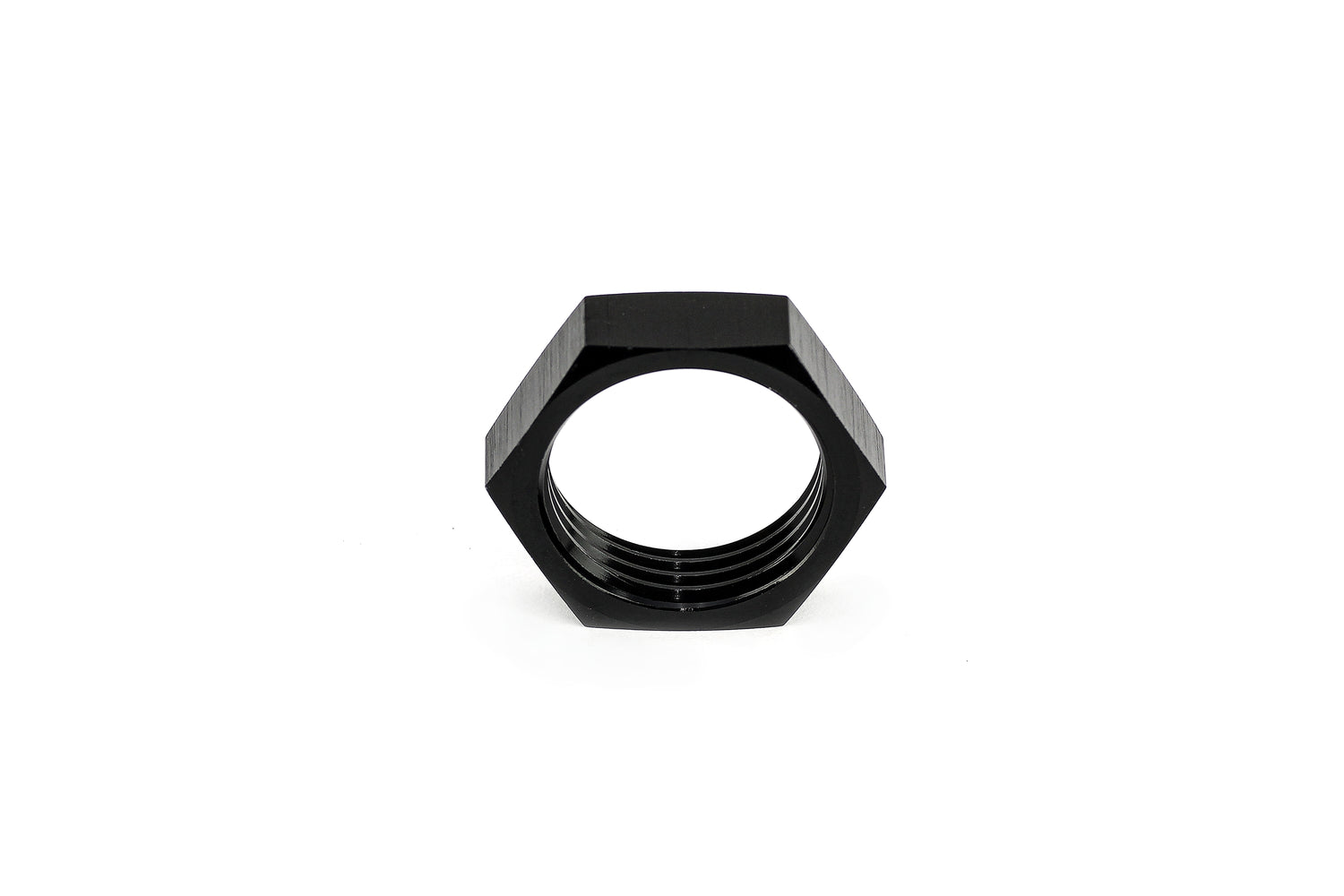 Jam nut for AN-12 bulkhead adapter, machined from 6061 aluminum, durable black anodizing for corrosion resistance.