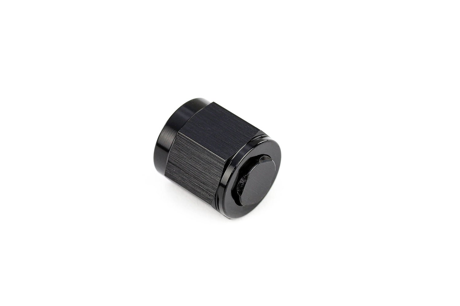 Aluminum screw on cap for AN-8 37 degree flare, machined from 6061 aluminum, durable black anodizing to provide excellent corrosion and abrasion resistance.