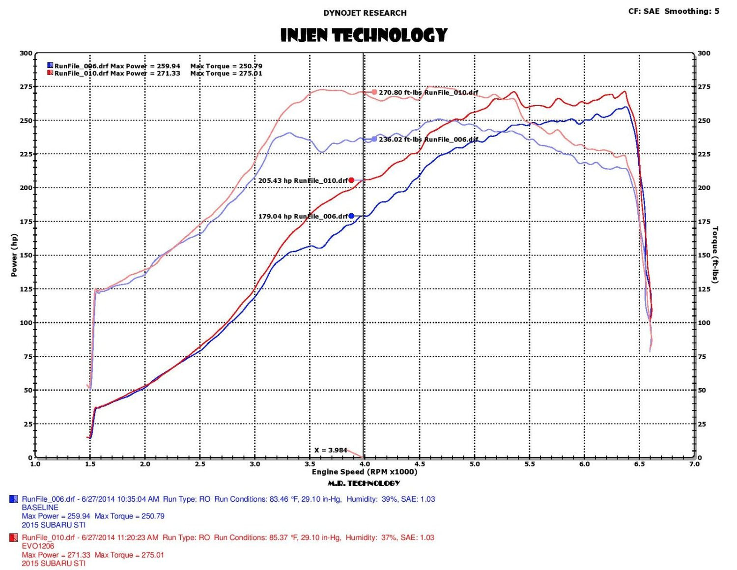 Roto-molded Housing and Ram Air Scoop: The EVO1206 system features our 2-piece box design that incorporates our boost plenum. The box attaches to our fully incorporated ram air scoop to capture the maximum amount of cool air to feed that hungry turbo. , , 6061 Aluminum Intake Tube: The EVO1206 Evolution Air Intake System uses a custom designed and dyno-tuned, aluminum intake tube that utilizes our patented air fusion and MR technology to produce huge power gains while retaining an OE quality fit and safe fuel trim levels. SuperNano-Web Dry Air Filter: "That's massive!"is all you will hear about this SuperNano-Web Dry air filter that is included with the EVO1206 cold air intake system. This filter has been uniquely designed to work with the downward facing orientation to ensure a leak-proof seal. Using the largest filter possible for this application has increased the available air volume - resulting in added power while keeping the installation process quick and simple. , , Quality Hardware: From the Stainless Steel Band Clamps with an inner protective liner to the reinforced automotive grade silicone coupler, every aspect is covered for a perfect and secure fit. , , Hassle-Free Installation: Make it easy! By designing this kit in a 3D workspace, you're ensured a quick and easy installation that not only increases the power output of your engine, but also provides a clean and powerful look that others see every time you pop your hood. Dyno Proven: Clean and simple, NUMBERS talk! Injen has put in the time and diligence to stand behind our performance data. We put in the time to test and prove that we have developed a superior kit for your Subaru. After hours of designing and dyno teWRX STIng, Injen is proud to say that the EVO1206 Evolution Air Intake system puts down numbers of up to 26 additional horsepower and 34 Ft.-lbs. of torque.