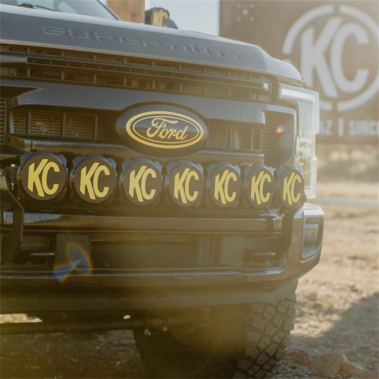 The GEN 4-5 2017+ Ford Super Duty Front Bumper 7-Light Gravity LED Pro6 Light Bar Kit is an essential upgrade for truck owners seeking superior off-road lighting. This kit easily mounts a light bar to your truck by combining our robust Front Bumper Mount with the iconic KC 7-light Gravity LED Pro6 Light Bar, making sure that you'll fear no shadow. MOUNTING BRACKET-Custom Fit: Precisely engineered for GEN4-5 2017+ Ford Super Duty F-250, F-350, F-450, and F-550 models, ensuring seamless integration. Durable Construction: Made from steel with a black textured powder coat, guaranteeing enduring resilience. Easy Installation: The bolt-on design offers easy installation, utilizing the front tow hook area for a neat, factory-integrated look.45" 7-LIGHT GRAVITY LED PRO6 LIGHT BAR-Advanced GRD Technology: Employs KC's patented Gravity Reflective Diode (GRD) for outstanding beam shape, performance, and clarity. Mixed Beam Pattern: Incorporates both Driving and Wide-40 Beam lights for a versatile lighting solution, ensuring comprehensive visibility. Infinity Ring System: The patented system provides adaptability and customization to meet your specific lighting needs. Race-Tested Durability: Proven in desert racing, providing unmatched robustness and reliability. Note: requires trimming on OEM tow-hook plastic covers. WHAT'S IN THE BOX-(1) 7-Light Gravity LED Pro6 45" Light Bar-(1) Light Bar Mount for Gravity LED Pro6 7-Light Bar Front Bumper GEN4-5 2017+ Ford Super Duty (for driver and passenger sides)-(7) Gravity Pro6 Light Cover Black / Yellow KC Logo-(1) Plug-n-Play Wiring Harness and Switch. FITMENT-GEN4 GEN5 2017+ Ford Super Duty. Enhance your Ford Super Duty's off-road capabilities with this all-encompassing kit. It's designed for those who prioritize exceptional off-road performance and durability. Light up your adventures with confidence and style, powered by the unmatched performance of the 7-light Gravity LED Pro6 Light Bar.