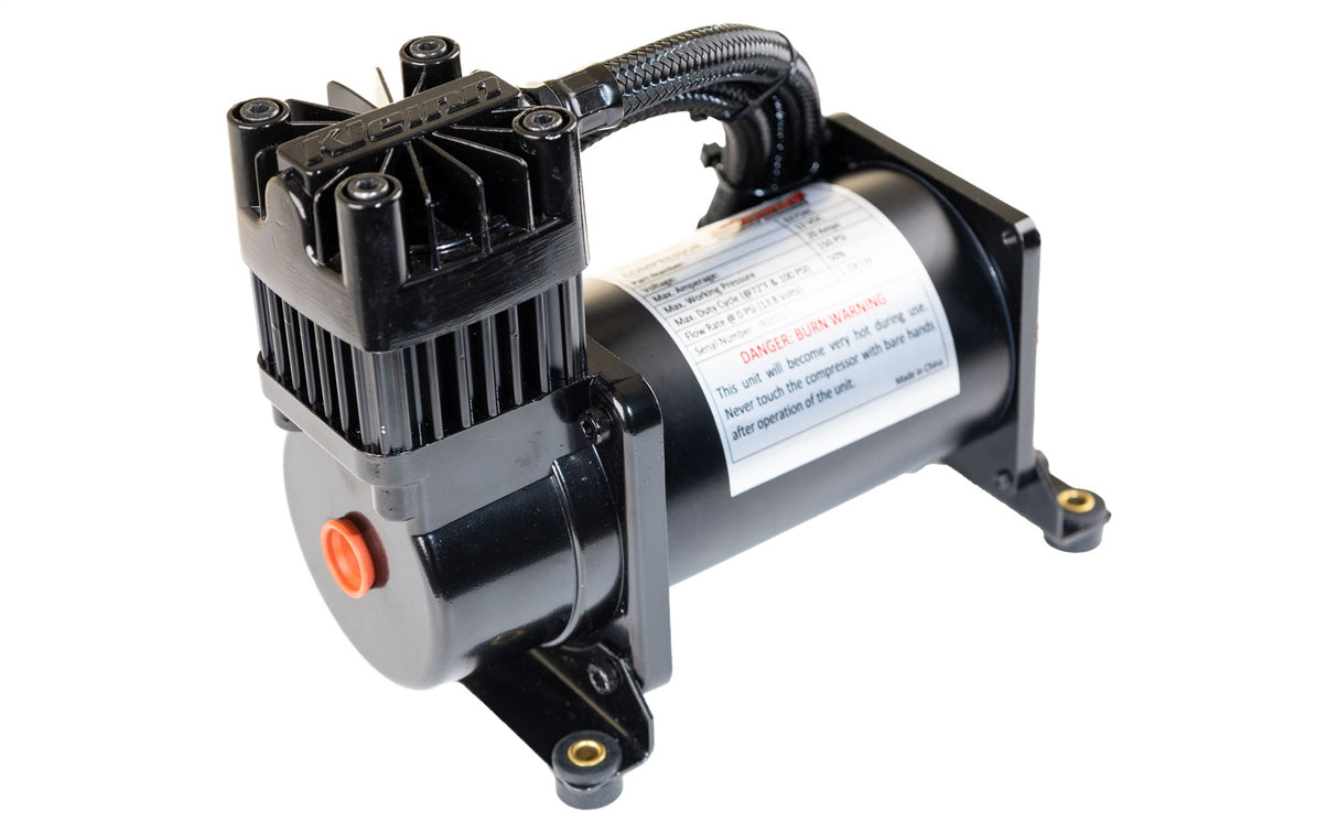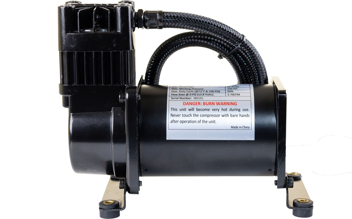 A medium duty 12-volt air compressor designed to fill up to a 2.0 gallon air tank. Features include a thermally protected motor and increased CFM output for faster fill times. Sealed to prevent damage from the elements. Replacement 150 PSI, 1.7 CFM, 50% duty high output air compressor for 6275 air system, GMTRK-2, HK5, HK-EURO and HK6. Includes remote "Snorkel System" air intake and air filter to extend compressor life.