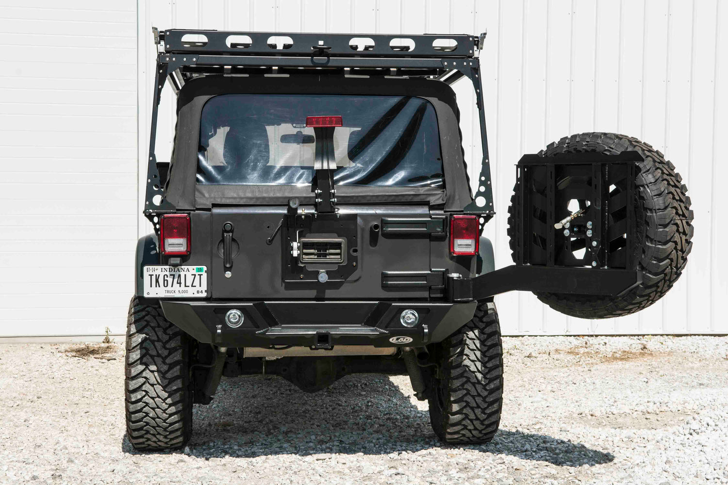 The LoD Offroad Jeep JK Destroyer Shorty Bumpers with Tire Carrier are engineered to a higher level. The stealthy look and versatile functionality makes a bold statement while protecting and enhancing your off road Jeep on the trail. The increased features allow you to customize your Jeep like never before! The rear bumper has been upgraded with light bezels which allow easy light change out by removing a few screws. The Destroyer Rear Bumpers fit universal flush mount, Rigid-D Pro series, Baja Squadron Series Lights, and LoD Offroad LED lighting by switching out the bezels. Orders with no lights will receive blank bezels to fill the light housing cavity. All Destroyer Tire Carriers come with high end industrial tapered roller bearings at the hinge point to decrease friction and wear. This allows effortless carrier operation like never before. The tire carrier can hold up to a 38" tire and still use the accessory options! The Destroyer Tire Carrier has way more options to fit all your needs on and off the trail. Fits your Nato Jerry cans or RotoPax gas you can easily adjust the gas cans up and down the tire carrier with a full 14" inches of adjustment. Trail rack has been upgraded with more adjustment to accommodate over-sized tire setups. The new Destroyer carrier design creates a door linked and non-door linked style setup in one. The linked carrier design is equipped with a one hand quick release push button to disconnect the carrier instantly. This makes it easier then ever to access or remove your carrier accessories. With more room on the carrier, we added more options. As a result, we created several tire carrier attachments from full adjustable gas cans to a universal multimounting system that allows you to attach axes, shovels, and more. The tow hitch receiver is built into the rear bumper and is tow rated the same as the factory(3500 lbs.). Better look, higher quality, and more options!