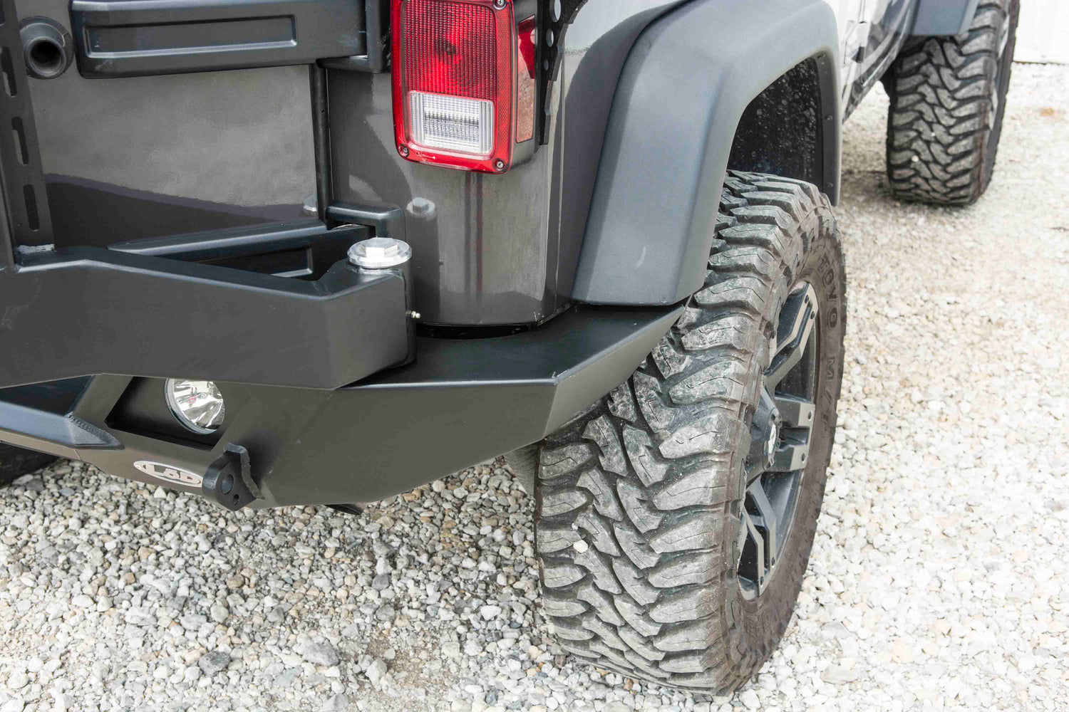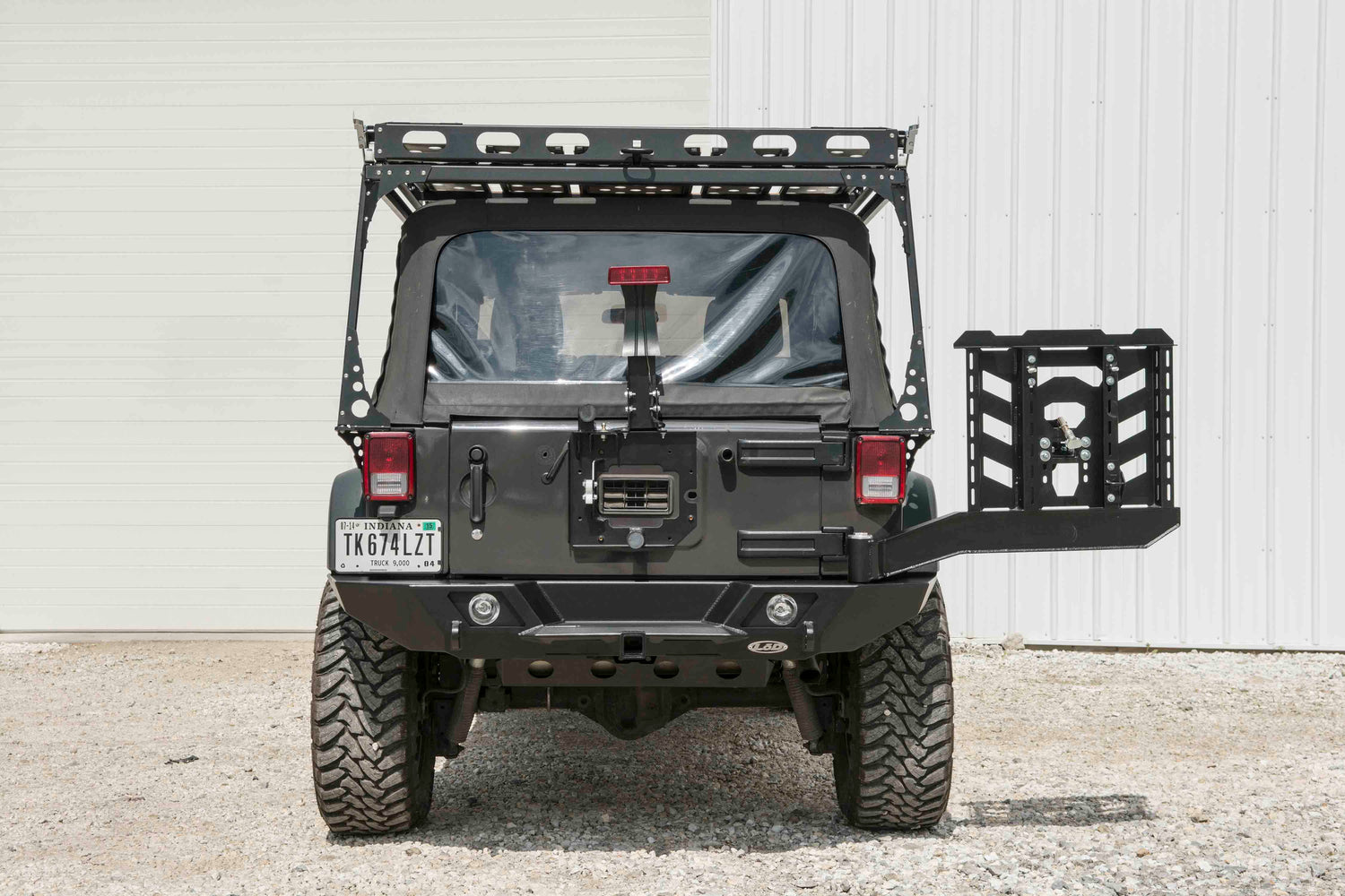 The LoD Offroad Jeep JK Destroyer Full Width Bumpers with Tire Carrier are engineered to a higher level. The stealthy look and versatile functionality makes a bold statement while protecting and enhancing your off road Jeep on the trail. The increased features allow you to customize your Jeep like never before! The rear bumper has been upgraded with light bezels which allow easy light change out by removing a few screws. The Destroyer Rear Bumpers fit universal flush mount, Rigid-D Pro series, Baja Squadron Series Lights, and LoD Offroad LED lighting by switching out the bezels. Orders with no lights will receive blank bezels to fill the light housing cavity. All Destroyer Tire Carriers come with high end industrial tapered roller bearings at the hinge point to decrease friction and wear. This allows effortless carrier operation like never before. The tire carrier can hold up to a 38" tire and still use the accessory options! The Destroyer Tire Carrier has way more options to fit all your needs on and off the trail. Fits your Nato Jerry cans or RotoPax gas you can easily adjust the gas cans up and down the tire carrier with a full 14" inches of adjustment. Trail rack has been upgraded with more adjustment to accommodate over-sized tire setups. The new Destroyer carrier design creates a door linked and non-door linked style setup in one. The linked carrier design is equipped with a one hand quick release push button to disconnect the carrier instantly. This makes it easier then ever to access or remove your carrier accessories. With more room on the carrier, we added more options. As a result, we created several tire carrier attachments from full adjustable gas cans to a universal multimounting system that allows you to attach axes, shovels, and more. The tow hitch receiver is built into the rear bumper and is tow rated the same as the factory(3500 lbs.).