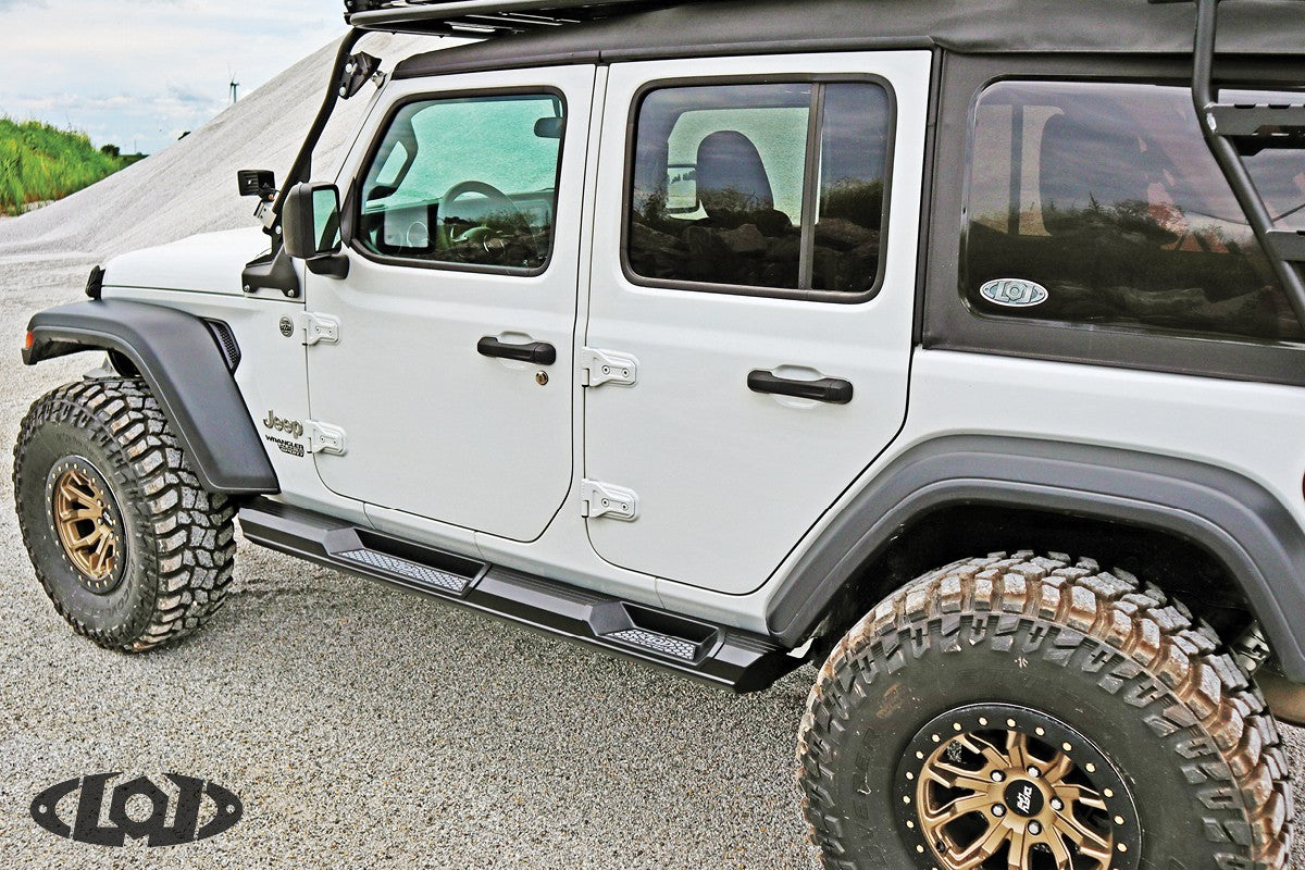 The LoD Offroad 2018+ Jeep JL Armor Lite Rocksliders Innovative One Piece Extruded Aluminum body construction for MAXIMUM strength! Configurable and modular design allows the addition of individual drop steps or larger one piece drop steps for easy entry and exit from your Jeep. Drop steps are easily removable within seconds without the use of any tools, so when you get to your destination, you can remove the drop steps and hit the trail and use your sliders for their intended purpose of protecting your Jeep! Optional high strength steel bolt on skid plate allows you to protect the aluminum sliders from rock rash while allowing the sliders to easily slide over obstacles! Easy install!! 3 piece High Strength Steel Frame mounted Design requires NO Drilling to install!! Black Powder Coated for a durable lasting finish.