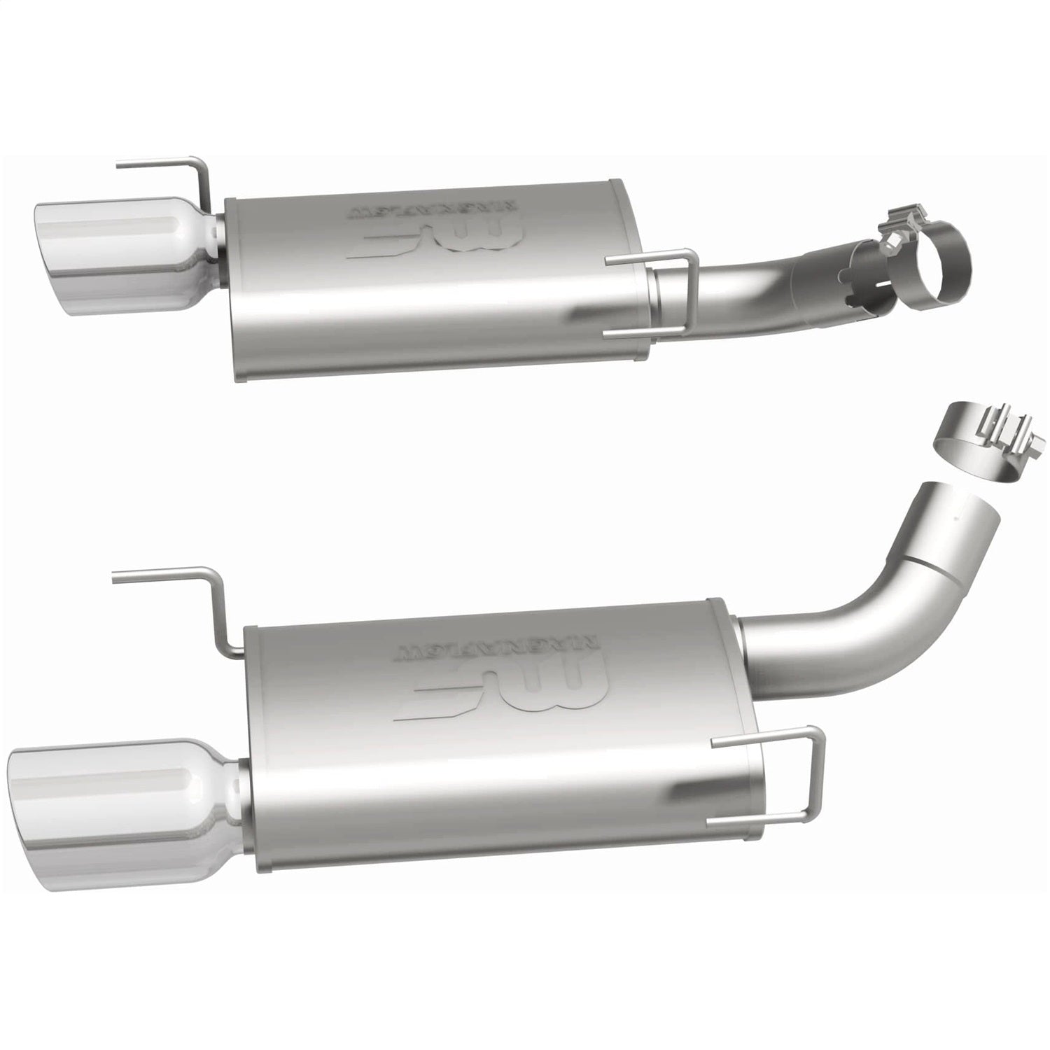 The MagnaFlow 2005-2009 Ford Mustang Street Series Axle-Back Performance Exhaust System brings enhanced engine sound and dyno-proven performance to your 4.6L, 5.4L 2005-2009 Ford Mustang with a healthy helping of our deep, resonant signature exhaust note at Moderate exterior and Mild interior sound levels. Thanks to its durable, corrosion resistant stainless steel design, this Ford Mustang exhaust system will handle whatever tarmac you decide to leave your mark on. This performance exhaust kit features an axle-back layout designed to replace your Ford Mustang's exhaust system from near the rear axle on back. With its fast-flowing, mandrel bent 2.5in. main piping and 2 Straight-Through mufflers ending in a Dual Split Rear exit with 4in. Polished Welded-On Double Wall Angle Cut Rolled Edge tips, your ride will be sounding as awesome as it looks. Extensive 3D scanning during development has resulted in a direct-fit design that you can easily install yourself. 15882 is produced using CNC precision robotic manufacturing techniques and is backed by MagnaFlow's 1-year limited finish warranty and limited lifetime construction warranty.