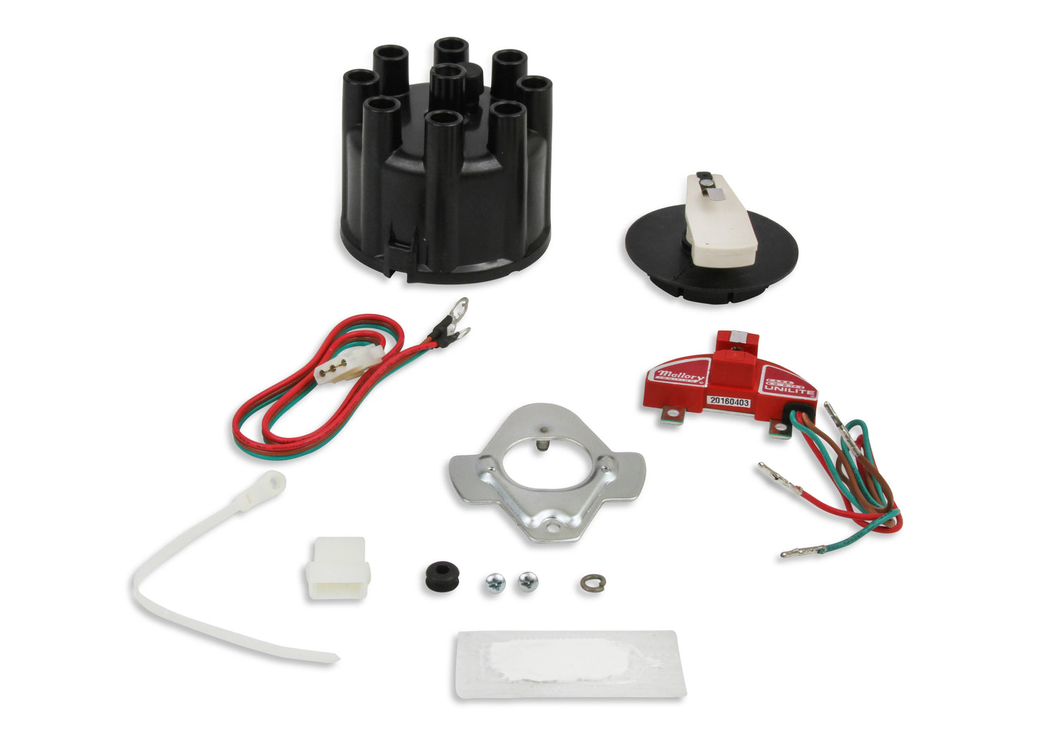 UNILITE CONVERSION KIT for OEM Point Distributors. Put an end to high maintenance Point ignition systems by installing a proven MALLORY UNILITE Ignition Conversion Kit. By using specialized electronic circuitry and a Infrared signal, ignition timing is stable from 1 RPM through 10,000. 12 volts negative ground only 1957-74
