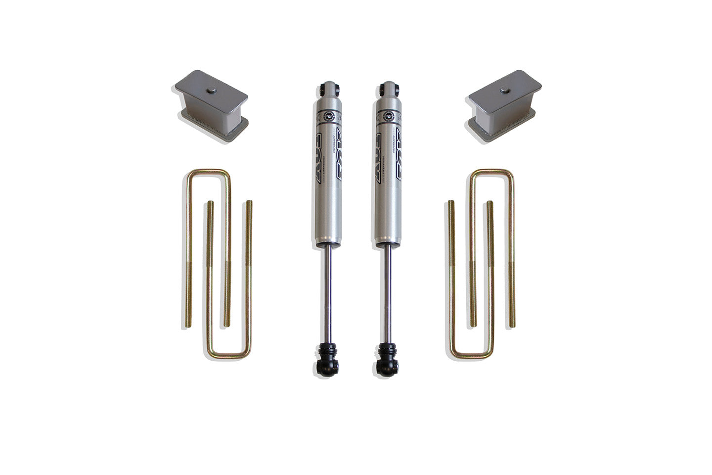 MAX TRAC SUSPENSION'S PART# 900430F IS A REAR BOX KIT INCLUDING 3" LIFT BLOCKS, U-BOLTS & A PAIR OF FOX 2.0 PERFORMANCE SERIES REAR SHOCKS