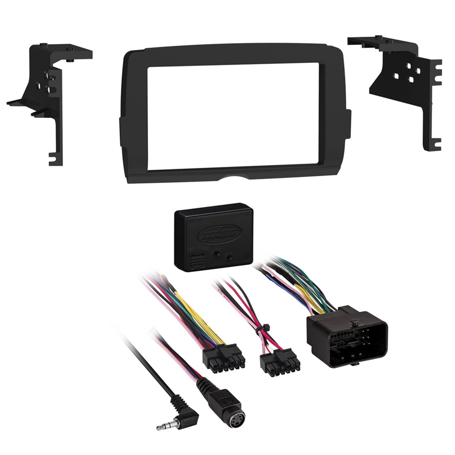 Radio installation kit used when replacing the OEM radio with an aftermarket radio. This kit is contoured to match the OEM dash. Kit will fit a double DIN radio in Harley-Davidson 2014-Up. This kit can only be used with an ISO DDIN radio that has an 'L' shaped chassis design, with the radio chassis at the top of the screen. Atpresent only the Sony XAV-AX100, XAV-AX200, and XAV-AX5000 radios have this design. This kit provides the ability to install an ISO DDIN radio replacement. Axxess interface, ASWC-1 (for retention of handlebar controls) and antenna adapter included.