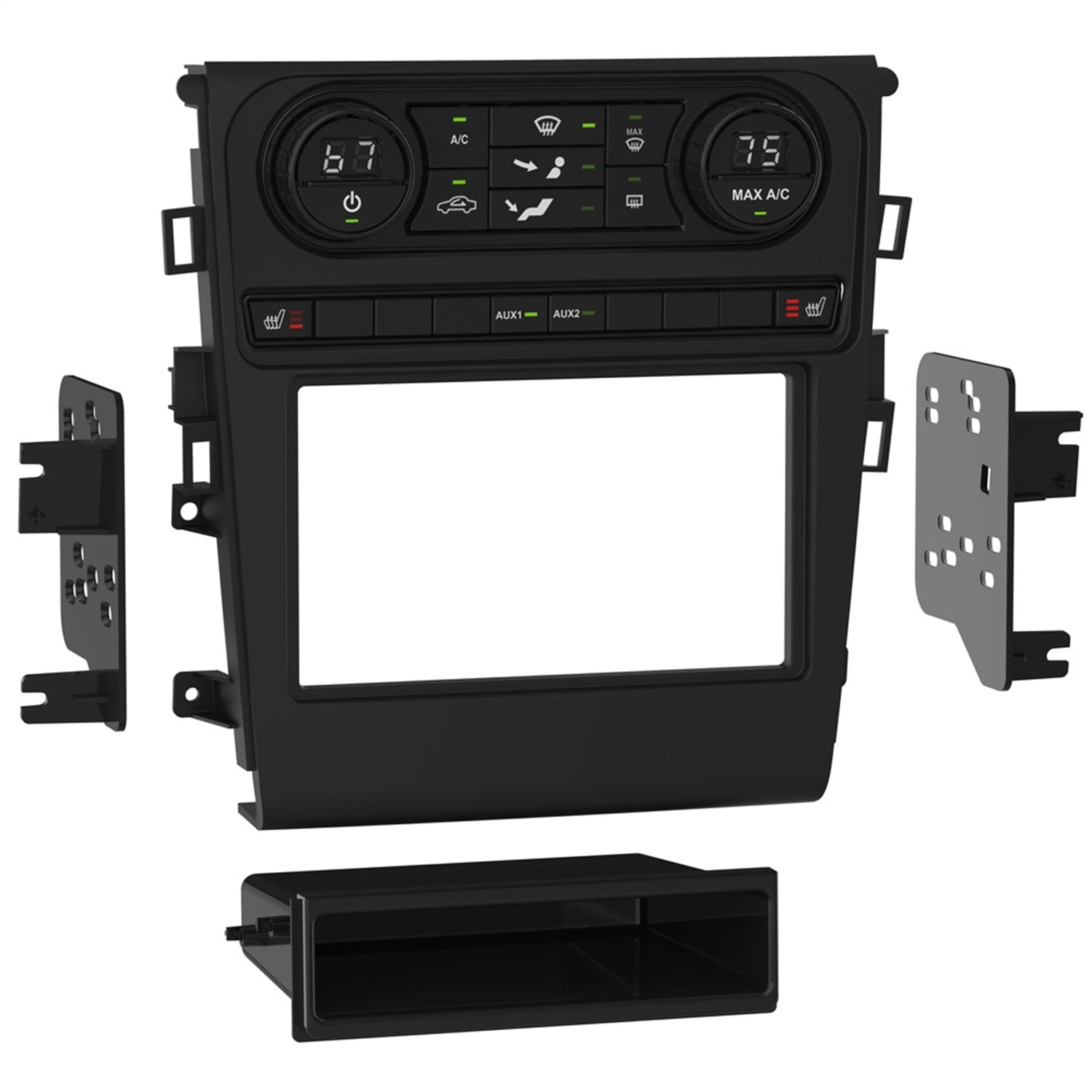 Radio installation kit used when replacing the OEM radio with an aftermarket radio. This kit provides the ability to install an ISO DIN aftermarket radio with pocket or a double DIN aftermarket radio. Scratch-resistant charcoal paint matches the factory color and appearance. Touchscreen display for climate and personalization features. Included interface for climate and steering wheel functions. Kit will fit in Ford Fusion 2015-2017 with single zone climate controls.