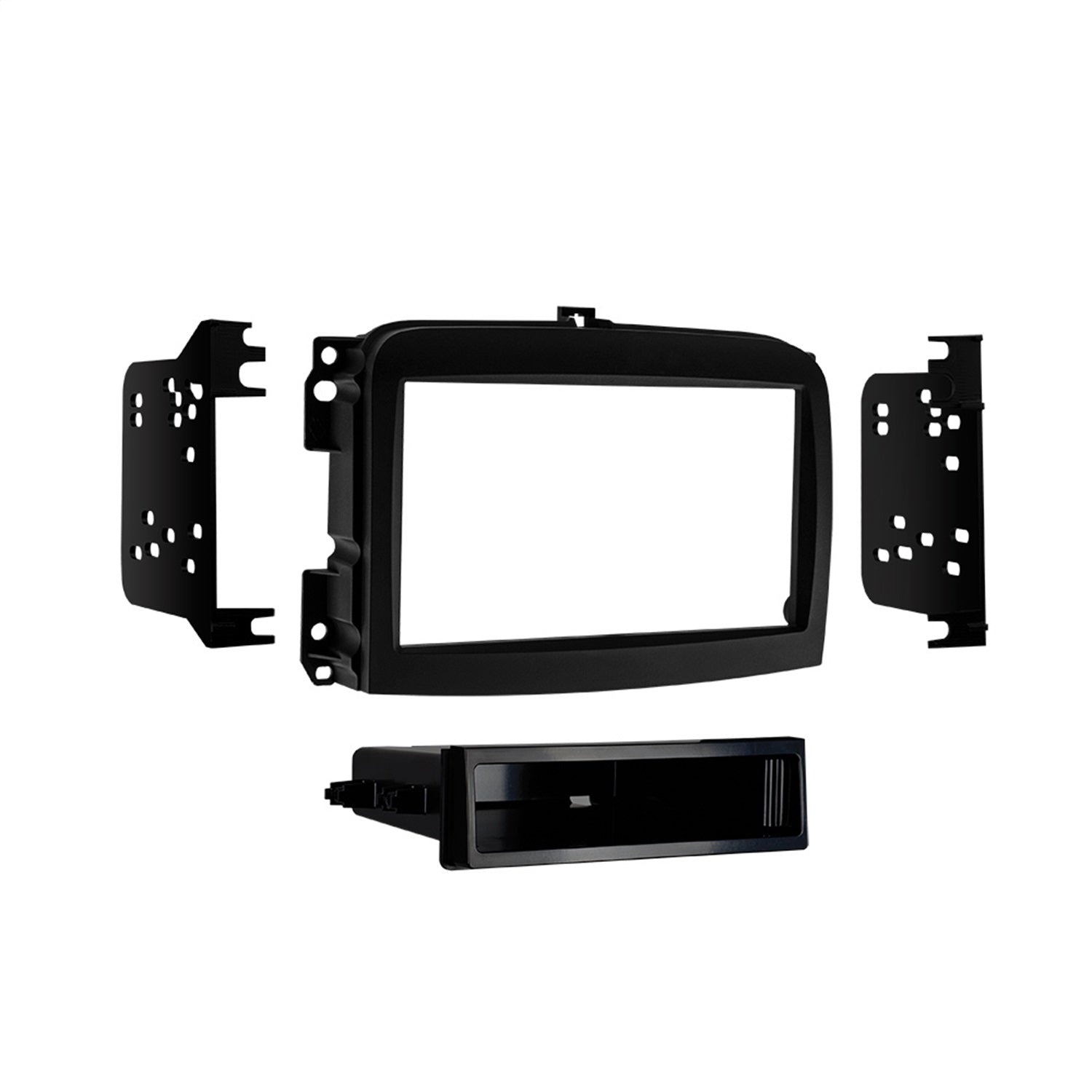 Radio installation kit used when replacing the OEM radio with an aftermarket radio. This kit has provision for a double DIN radio , painted gloss charcoal for a factory finish.