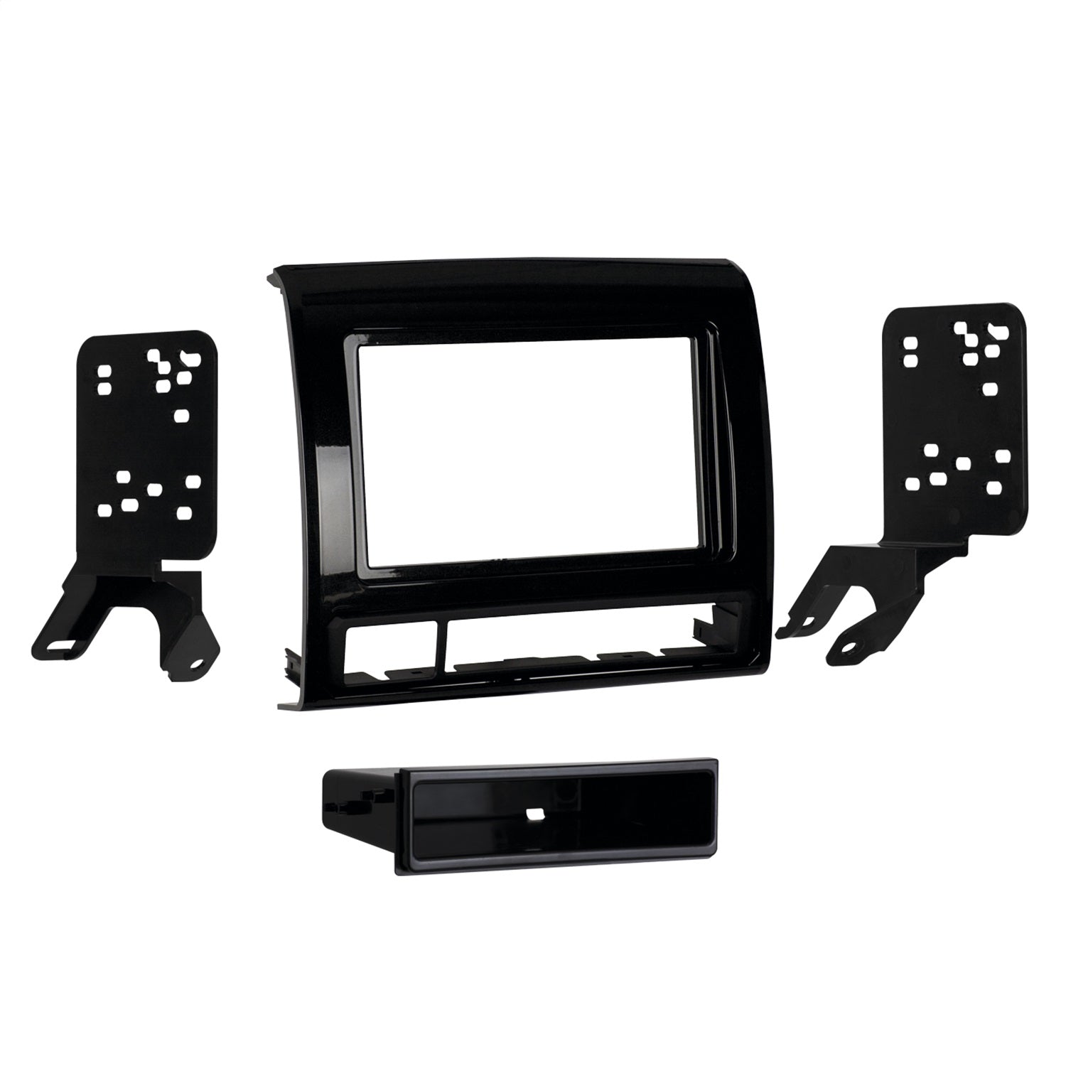 Radio installation kit used when replacing the OEM radio with an aftermarket radio. This kit has provision for a double DIN radio , painted gloss charcoal for a factory finish.