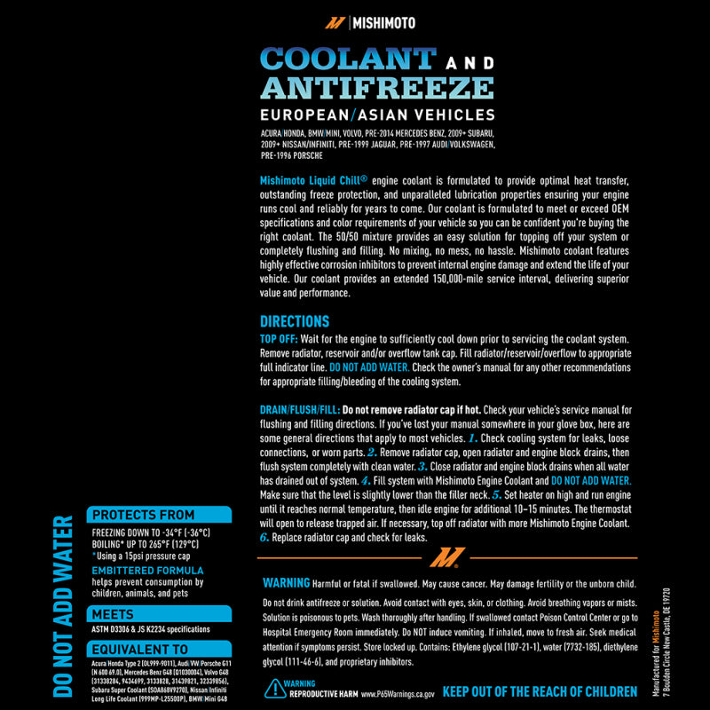 Mishimoto's Liquid Chill Original Equipment engine coolant is formulated with an ethylene glycol base to provide optimal heat transfer, boiling protection up to 265F, freeze protection down to -34F, unparalleled anti-corrosion, and superior lubrication, ensuring your engine runs cool and reliably for years to come. The pre-diluted 50/50 mixture provides an easy solution for topping off your system or complete flushing and filling. No mixing, no mess, no hassle.----We offer both universal and color-coded formulas that match your vehicle manufacturer' s specifications to make selecting the right coolant easy. Our coolant provides an extended 5 year/150,000-mile service interval, delivering superior value and performance. This one-gallon bottle of blue coolant is specially formulated to be equivalent to Acura/Honda Type 2, Porsche G11, Mercedes Benz/Volvo/BMW/Mini G48, Subaru Super Coolant, and Nissan/Infiniti Long Life Coolant. It meets ASTM D3306 and JS K2234 specifications for your Acura, Honda, BMW, MINI, Mercedes Benz, Subaru, Nissan, Infiniti, Jaguar, VW, Audi, or Porsche vehicle.