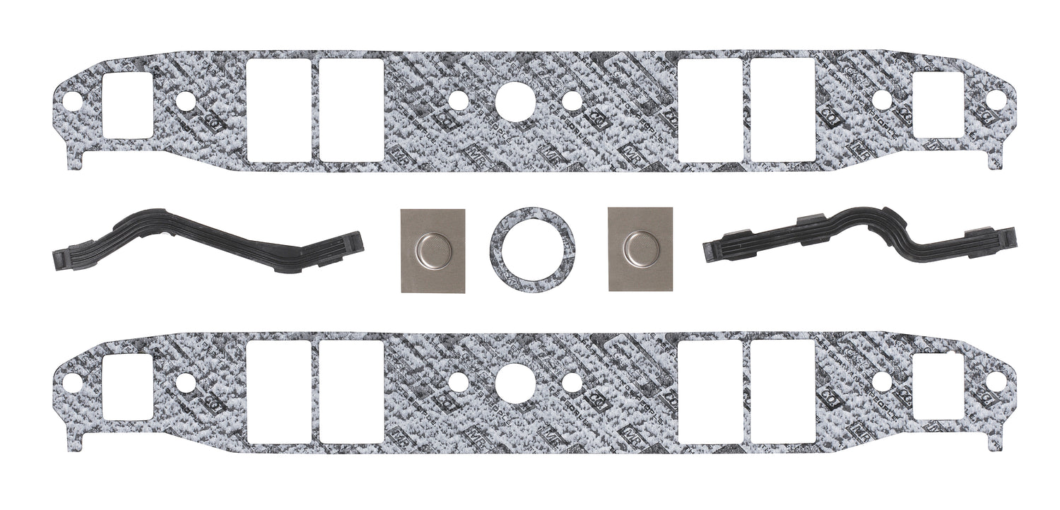 Intake Gasket; Rectangle Port Shape; Port Dimensions W-1.31 in. x H-2.1 in.; w/Steel Heat Riser Block Off Plates; Small Modified Port And Bolt Locations;