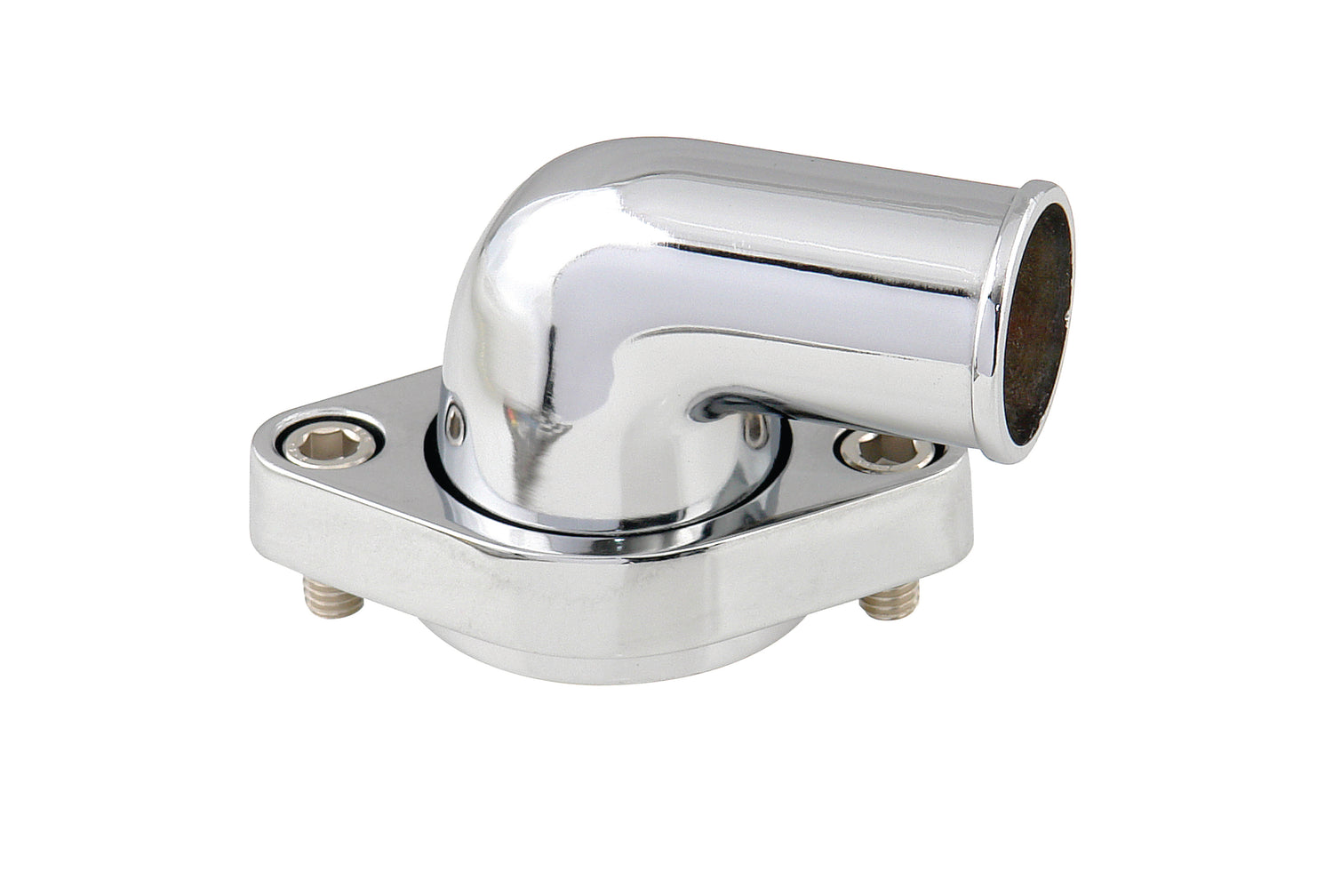Chrome water neck with a swivel top allows you to place your coolant hose where you want it to be, not just where the neck allows. Precision die cast for better fitment, these water necks are first polished to a high luster, then chrome plated. Features an O-ring style seal to prevent water leaks. Comes with O-ring gasket and mounting bolts.