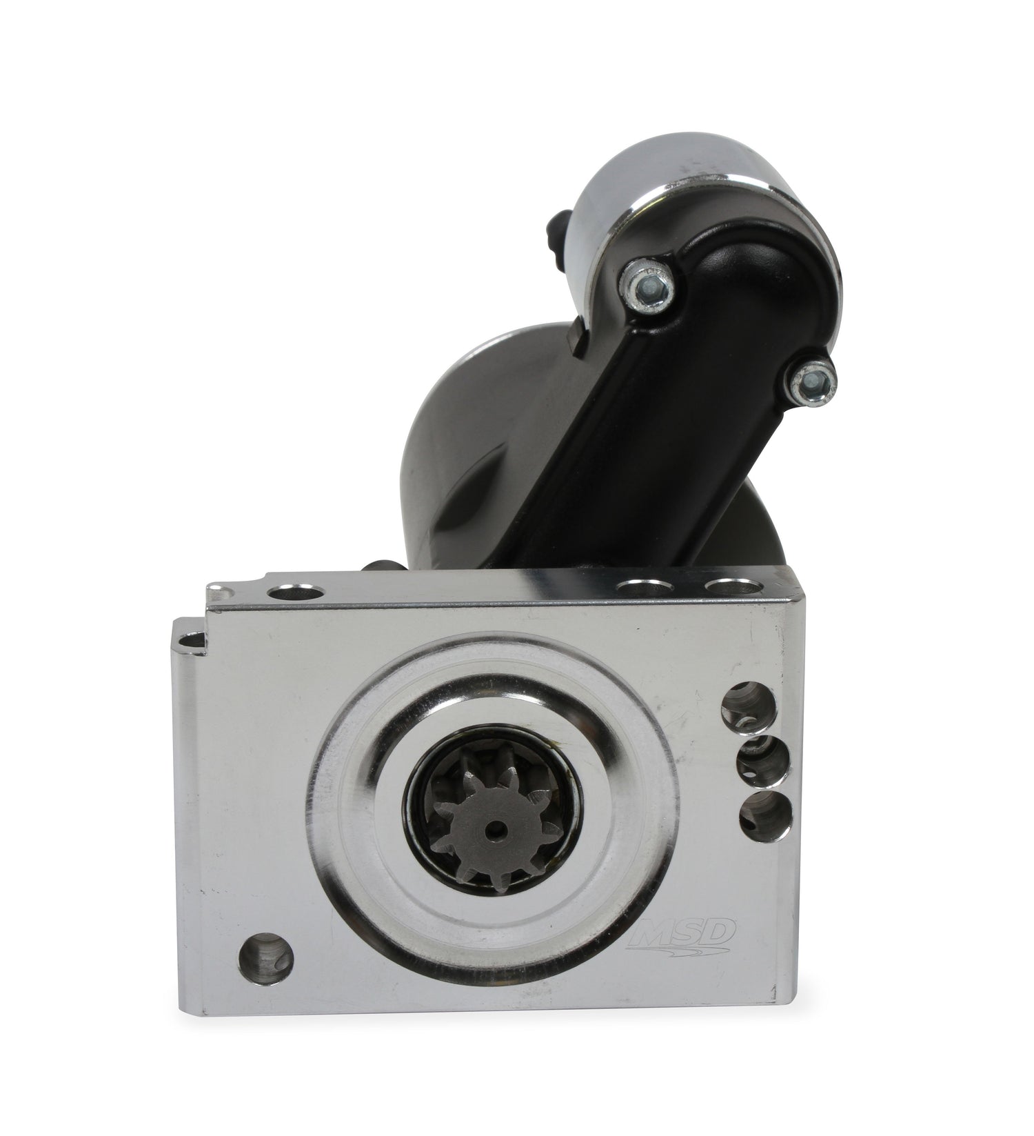 MSD's DynaForce Starters feature all new components beginning with a three horsepower motor. This power is used to crank over the reduced 4.4:1 gear set to deliver great torque to the engine's ring gear to get the engine turning. The compact housing clears most headers and oil pans, but just in case, we made the billet mount so it can be clocked in different positions to help in tight applications. The assembly is powder coated black and will stay looking good, even though it's underneath your car.