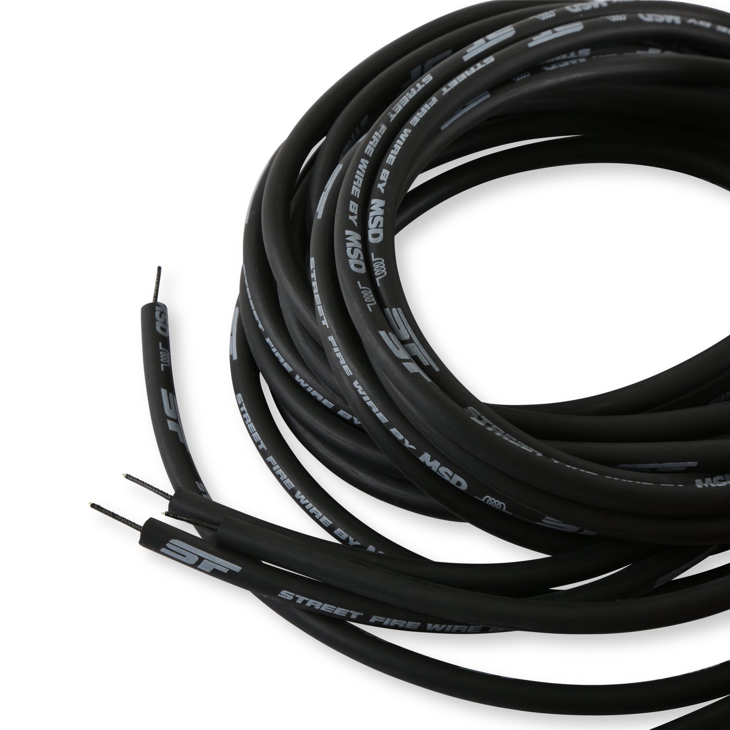The street fire spark plug wires feature a low resistance conductor that's wrapped in a sleek and durable black sleeve. The terminals are covered in black boots that protect the conductor from engine heat to ensure spark delivery.