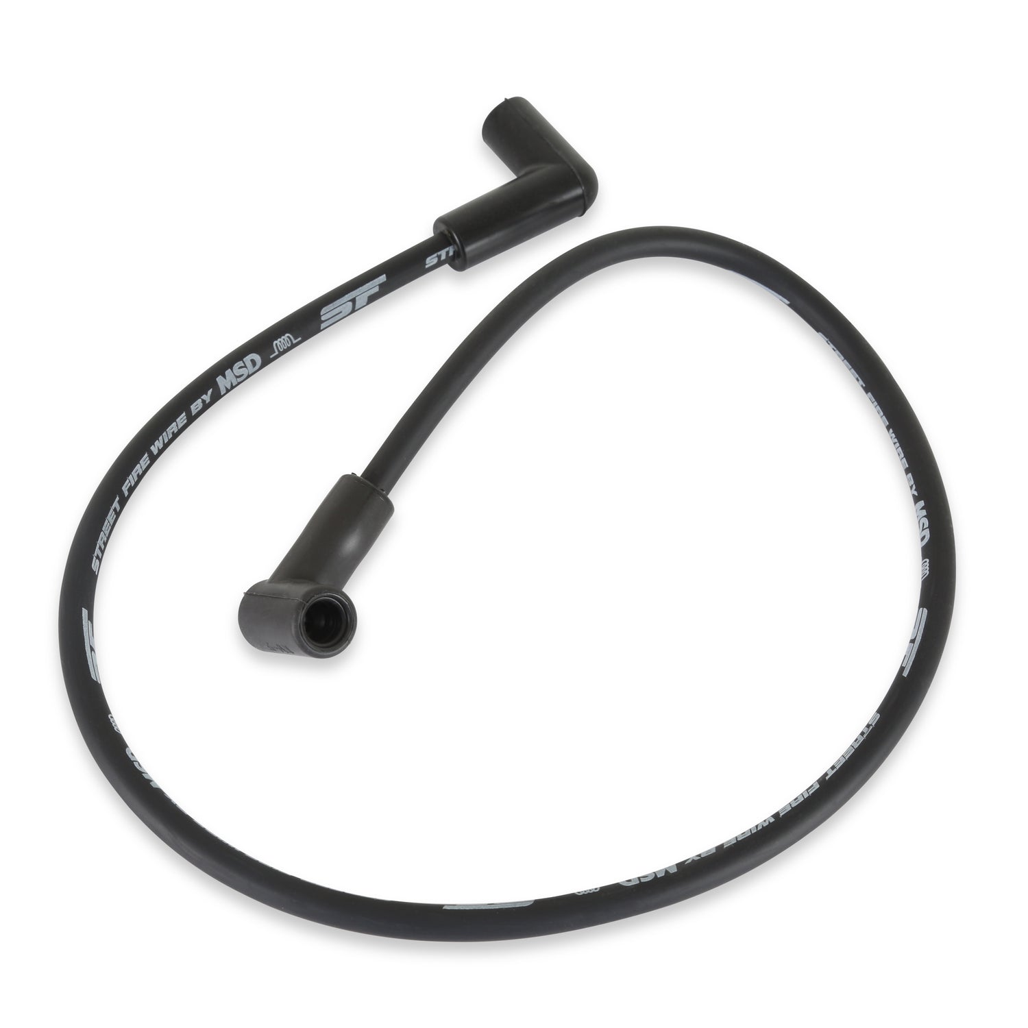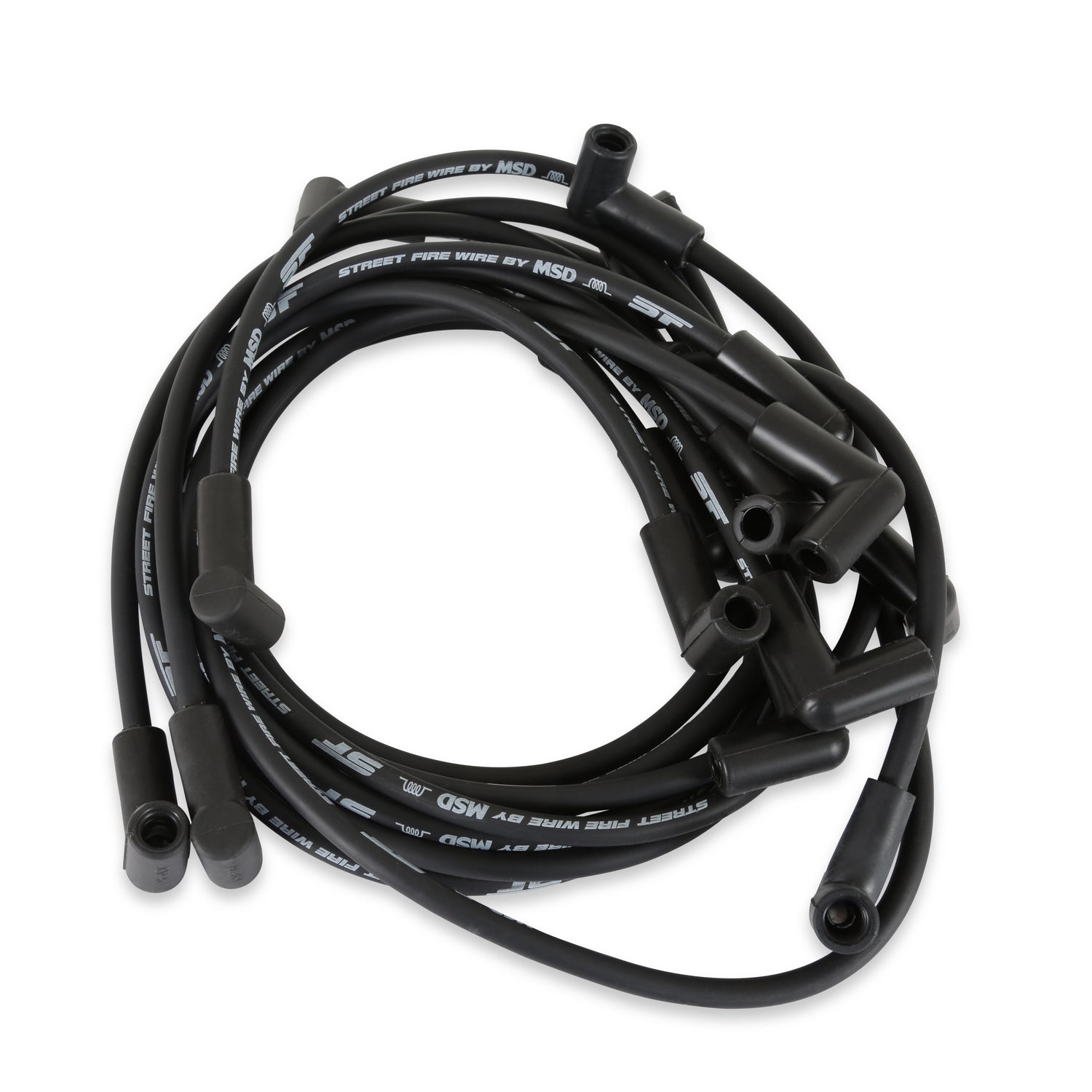 The street fire spark plug wires feature a low resistance conductor that's wrapped in a sleek and durable black sleeve. The terminals are covered in black boots that protect the conductor from engine heat to ensure spark delivery.
