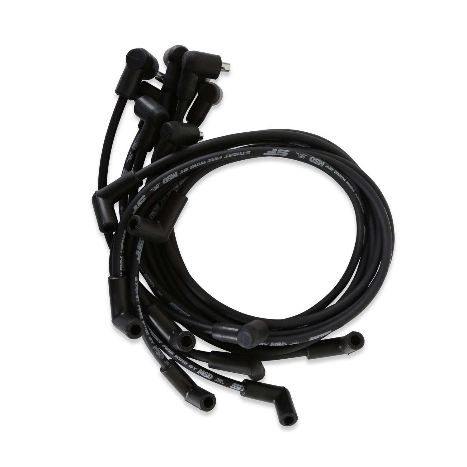 The street fire spark plug wires feature a low resistance conductor that's wrapped in a sleek and durable black sleeve. The terminals are covered in black boots that protect the conductor from engine heat to ensure spark delivery.