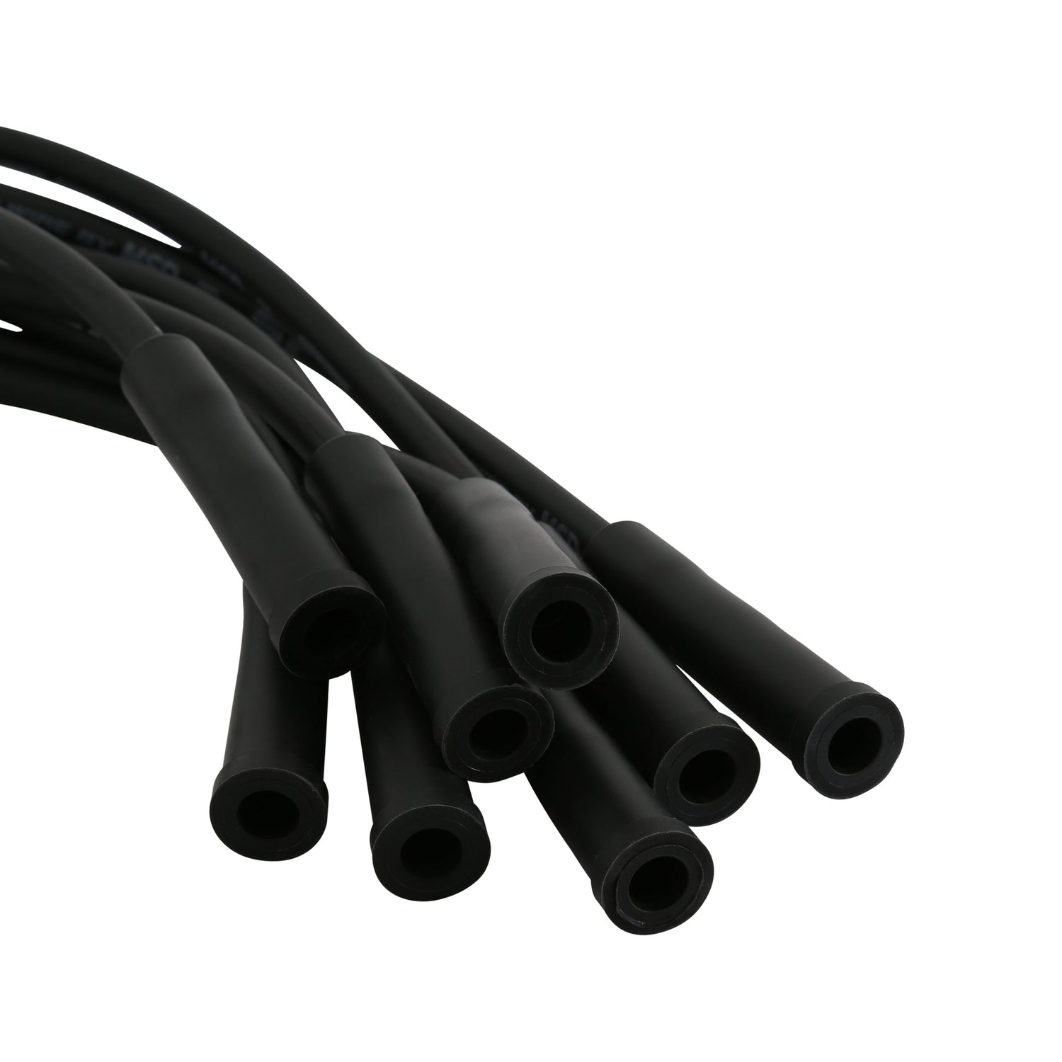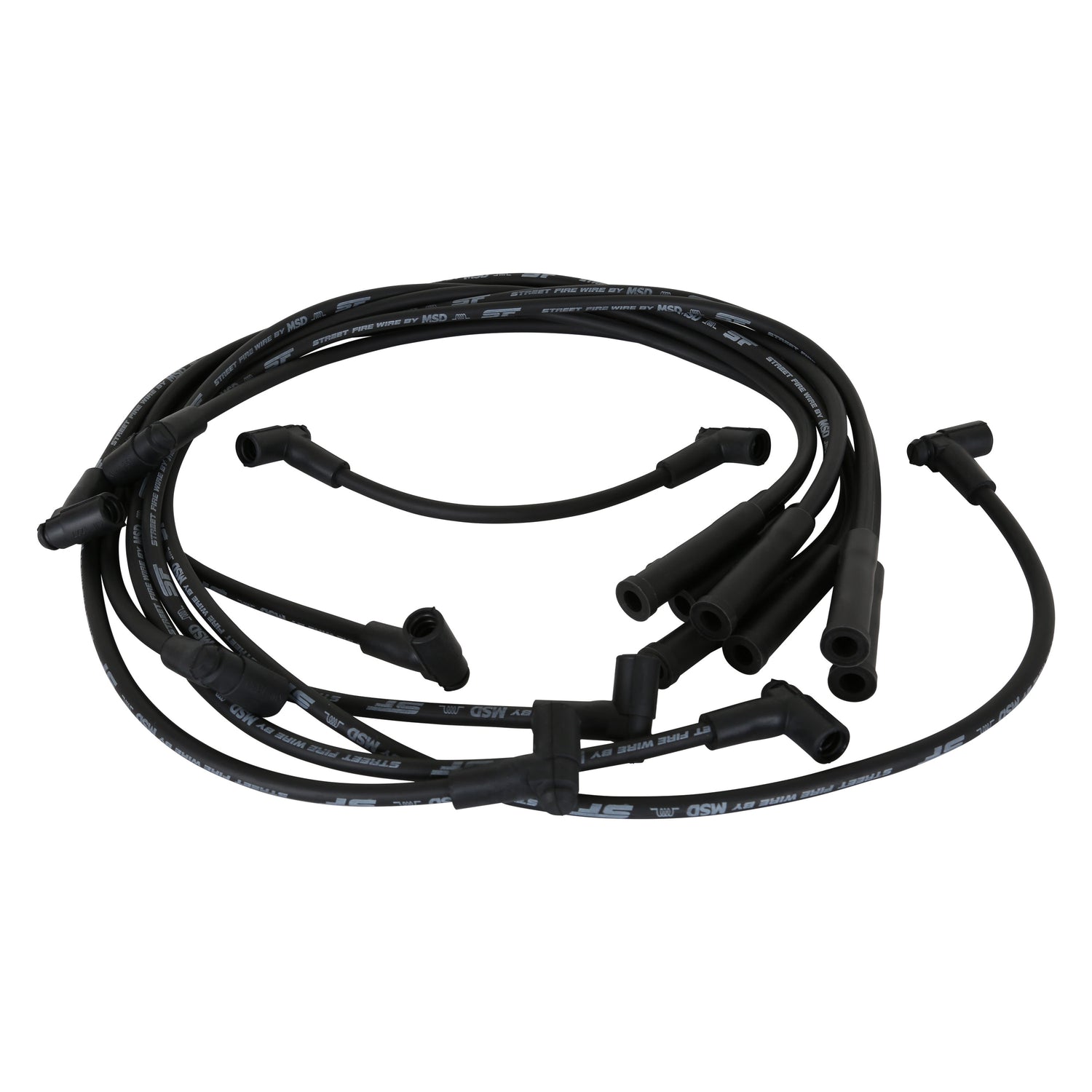 The street fire spark plug wires feature a low resistance conductor that's wrapped in a sleek and durable black sleeve. The terminals are covered in black boots that protect the conductor from engine heat to ensure spark delivery.