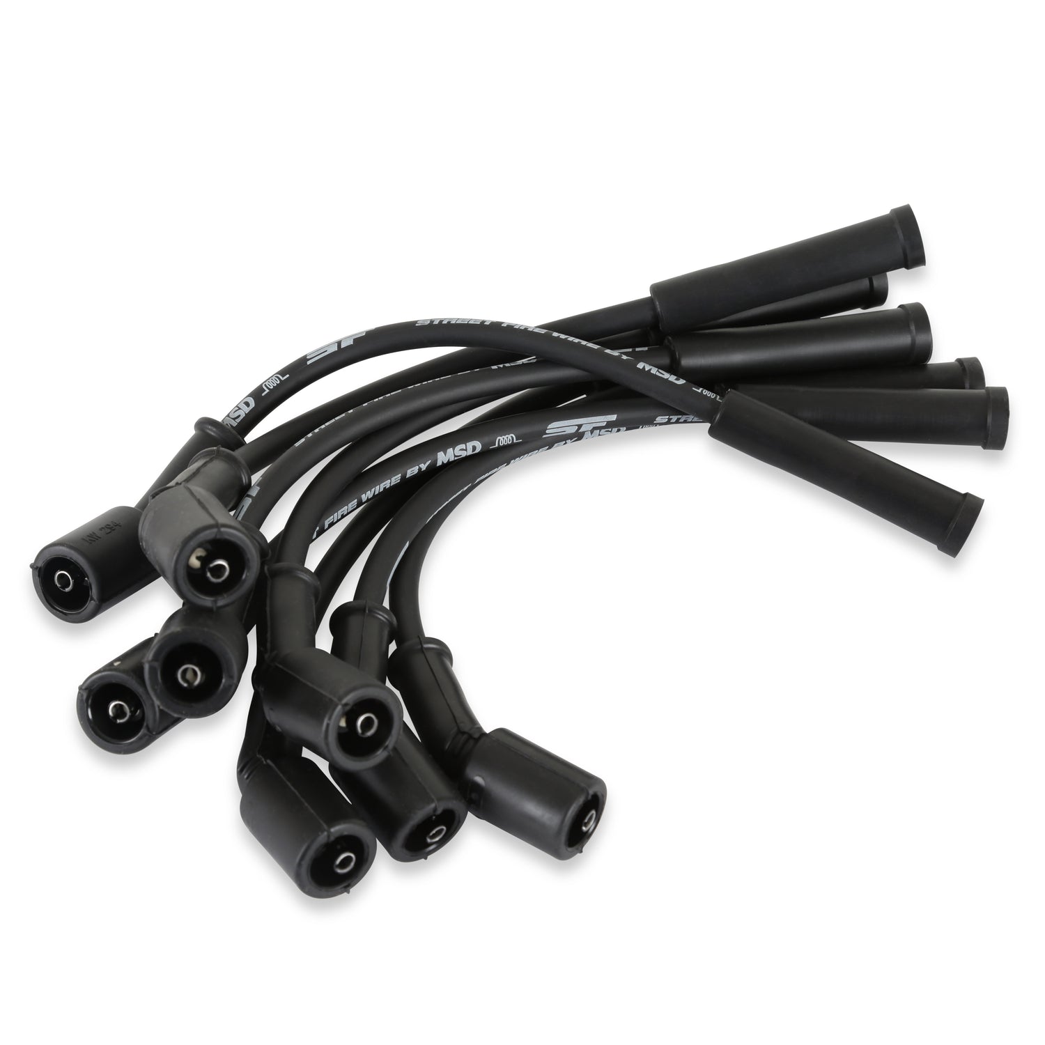 The street fire spark plug wires feature a low resistance conductor that's wrapped in a sleek and durable black sleeve. The terminals are covered in black boots that protect the conductor from engine heat to ensure spark delivery.