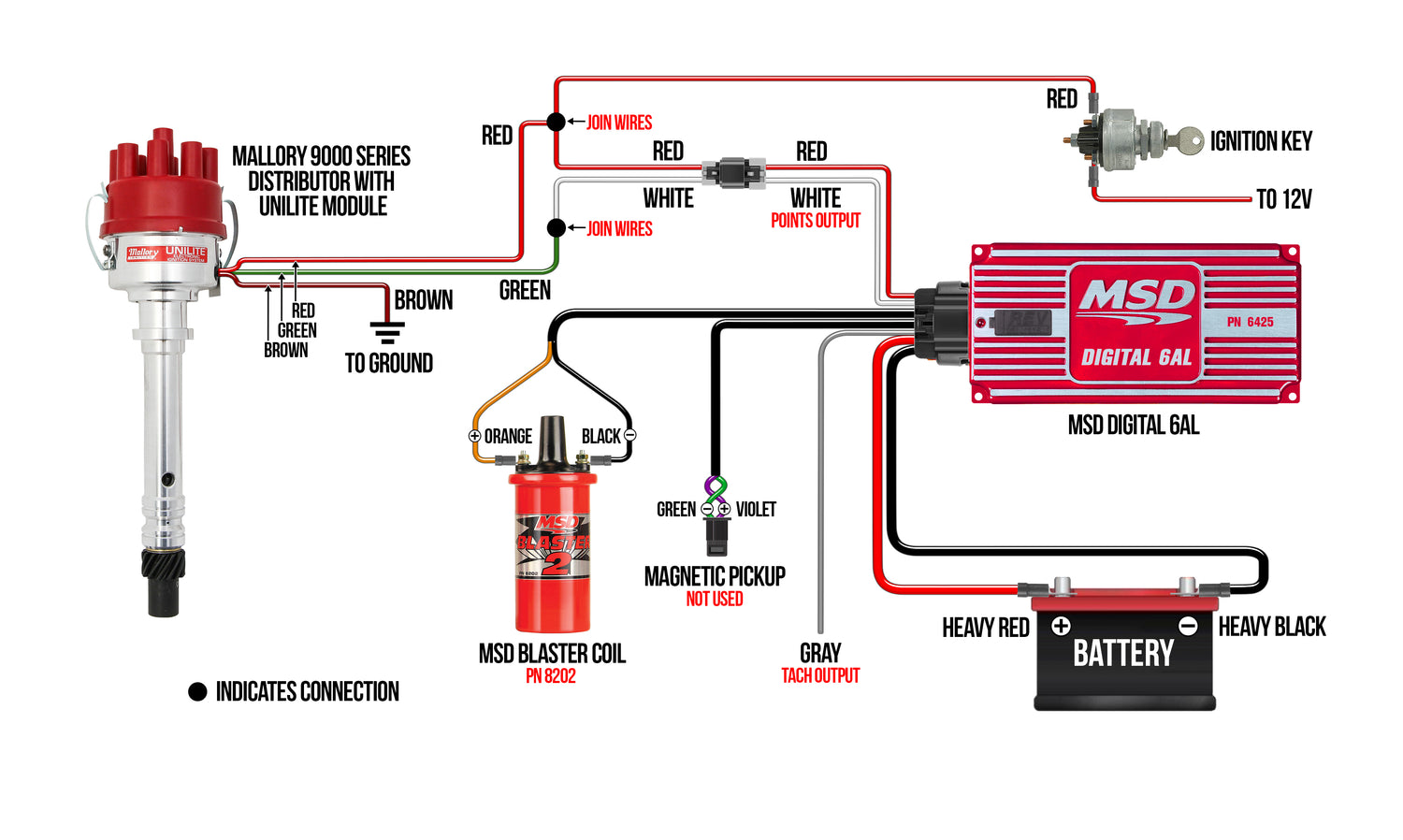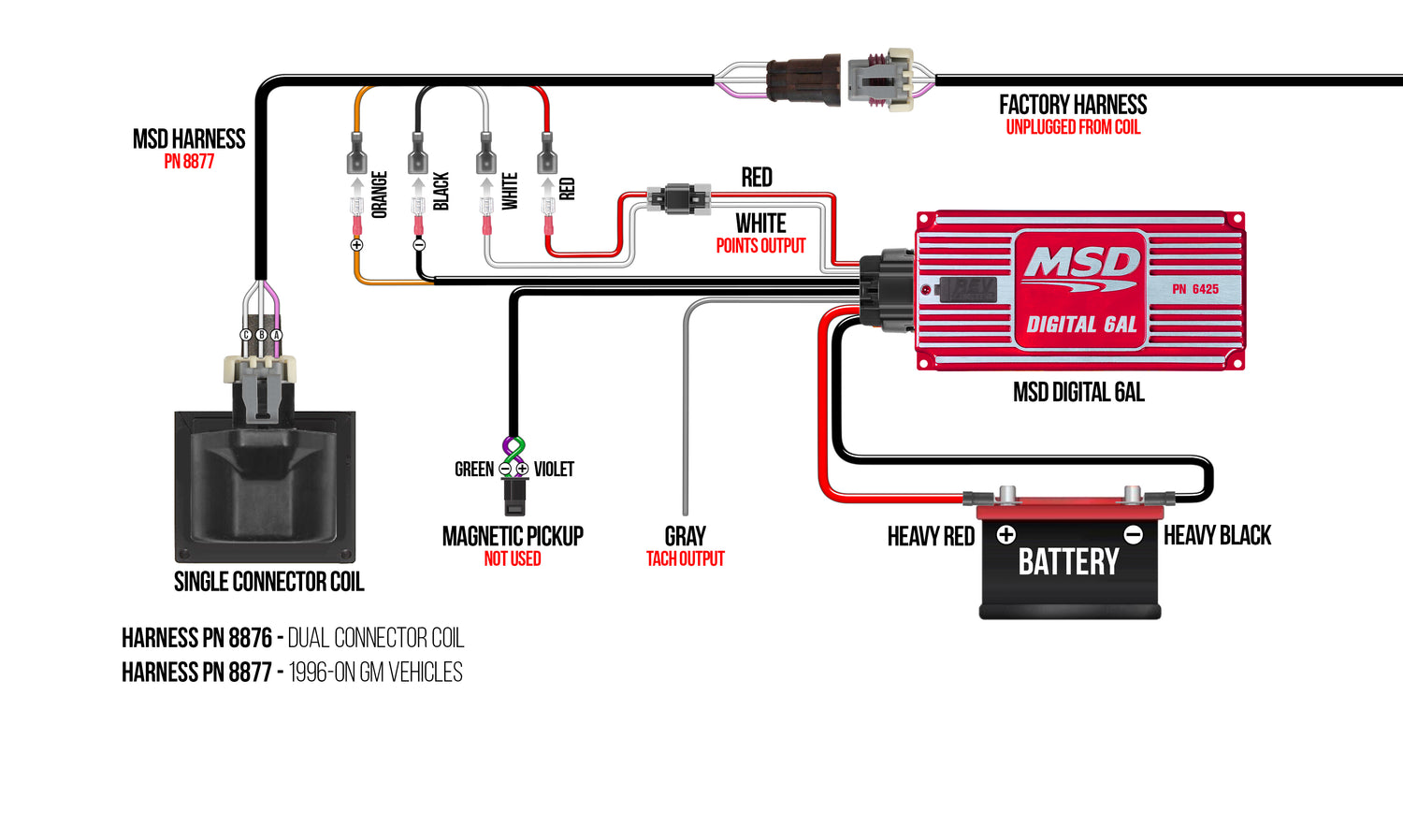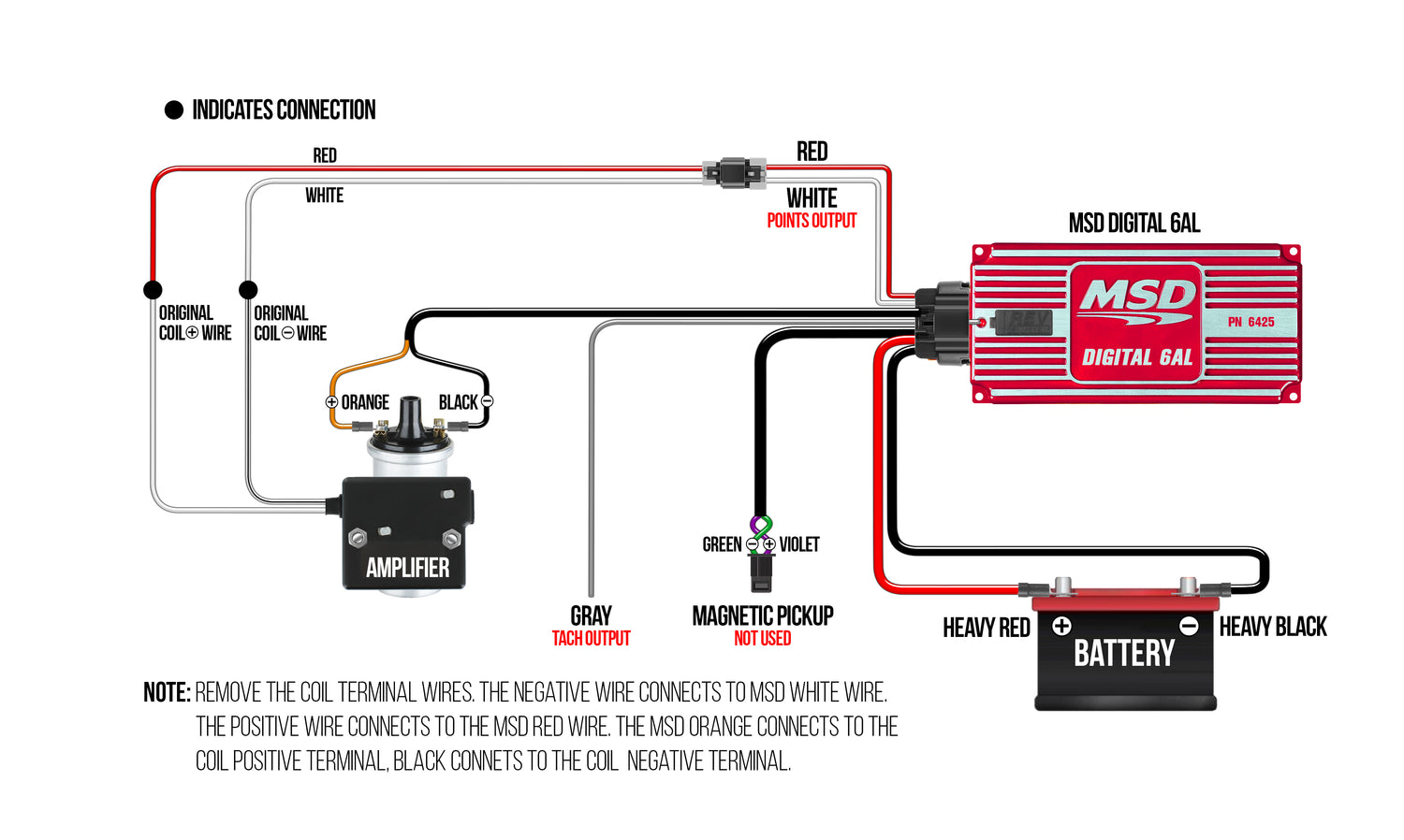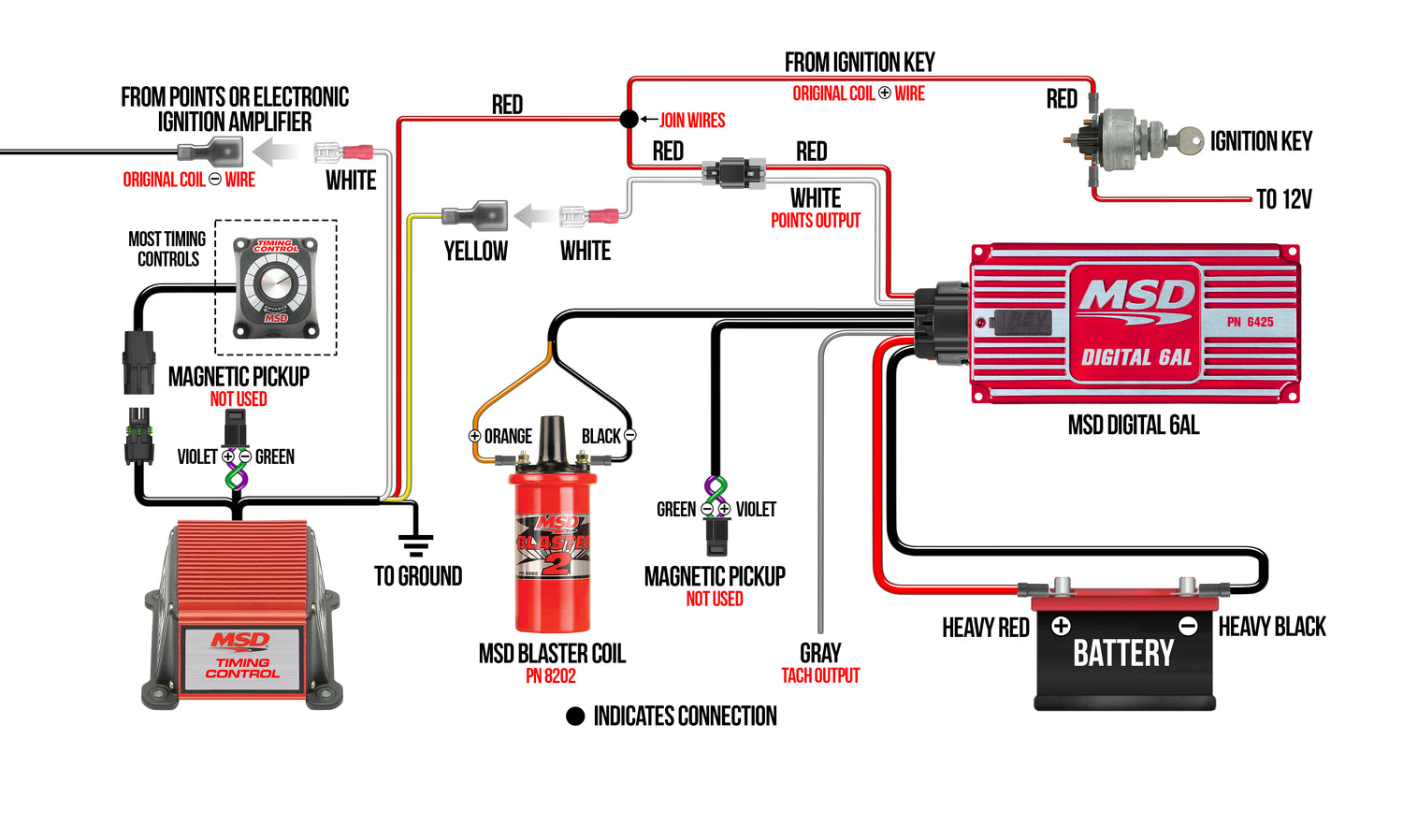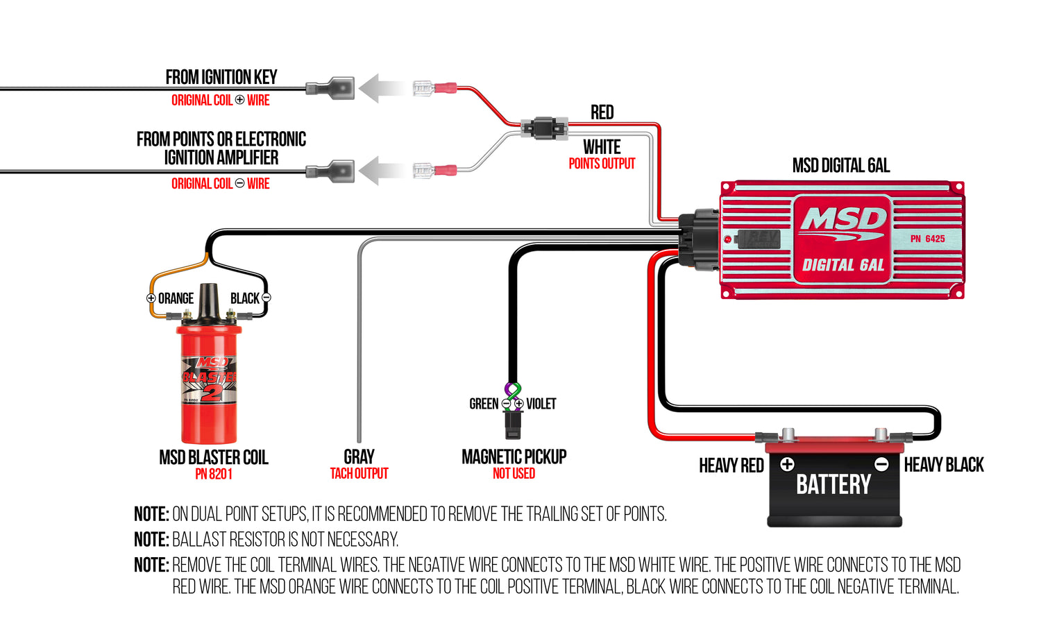 The MSD 6AL Ignition Control set the standards that other ignitions strive to reach. In fact, youll find ignitions from other companies that carry the 6AL name (and in some cases, the same part number). MSD raised the bar even higher with the revised Digital 6AL Ignition Control! The wiring of the Digital 6AL is routed out one end of the unit through a sealed and locking connector. This eases installation and keeps your wiring looking neat and clean. The rev-limiter of the 6AL is located right on top of the housing for easy access to the two rotary dials to set the limit in 100 rpm increments. Inside the Digital 6AL, youll find a microprocessor that monitors and controls every firing and rev limit. The circuits are updated with efficient components that help the ignition produce more power while drawing less current! In fact, the Digital 6AL delivers over 530 volts to the coil with up to 135mJ of spark energy for every firing! Increased output combined with MSDs proven multiple spark series is a win-win situation! The Digital 6AL is supplied with the wiring harness and the components youll need for installation. The 6AL is also supplied with vibration mounts. Both ignitions are compatible on 4, 6, or 8-cylinder engines with 12-volt, negative ground electrical systems. Theyll accept trigger inputs from breaker points, amplifiers, and magnetic pickups.