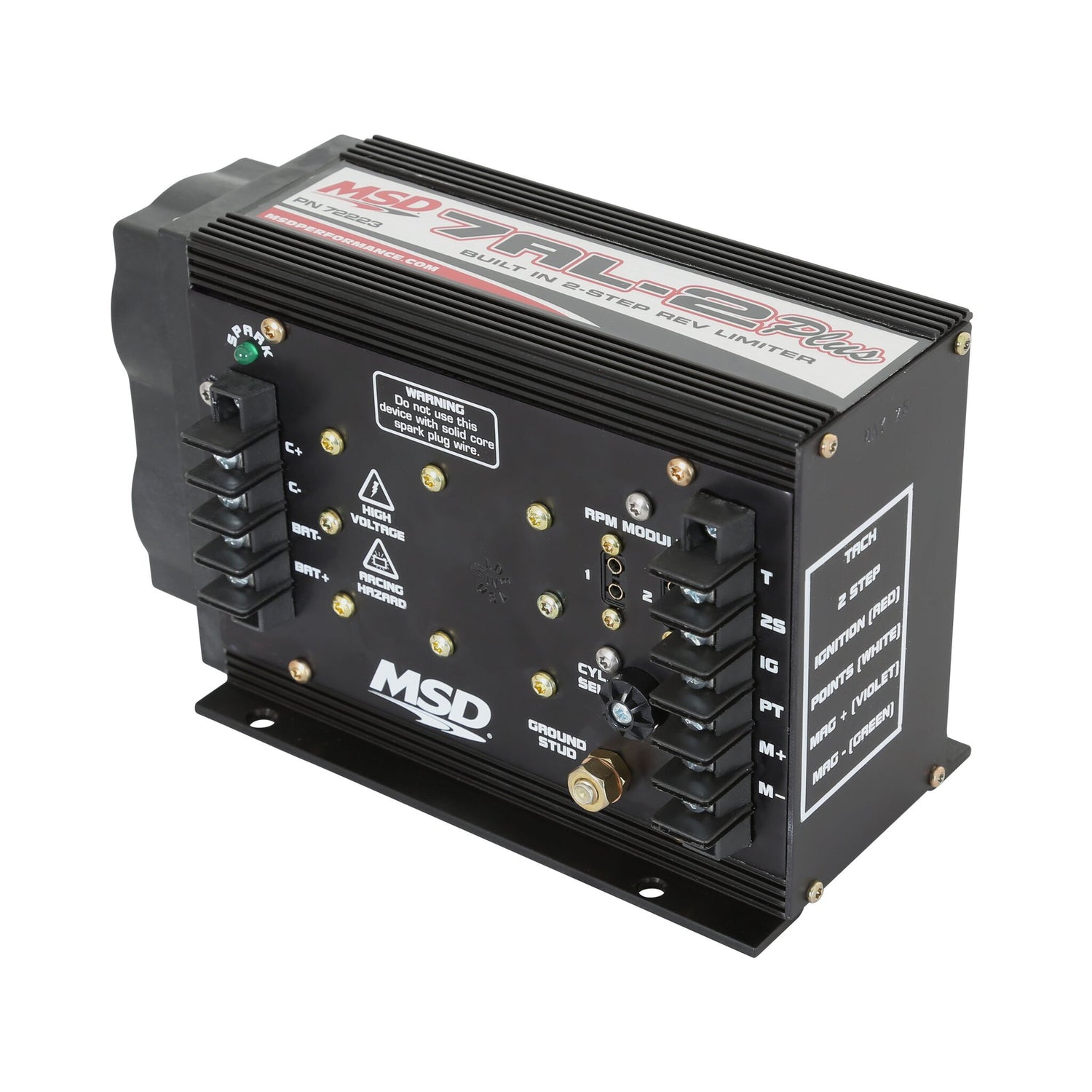 Youll recognize the 7AL-2 Plus Ignition Control now in Black! As its predecessor is the most popular ignition control used in drag racing. The Plus model updates the original 7AL-2 with improved internal components plus our engineers added a 2-Step Rev Control and a useful diagnostic LED. Racers will be happy to see that the updated components up the voltage output and spark energy! Over 40 Percent more spark energy in fact! Visually, youll notice the two terminal strips that allow for easier wiring in your race car. The LED over the power connections will come in handy for troubleshooting as it flashes only when the coil fires. That way you know that the coil, the trigger source and ignition are all functioning properly. The mounting pattern is the same as the 7AL-2 and is supplied with vibration mounts and a few rpm modules.