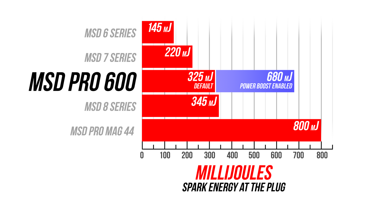 The Single Channel Pro 600 Ignition is engineered and built for the most demanding racing applications and is the HOTTEST single channel ignition box for use with the MSD Power Grid. This ignition is capable of running continuously at an energy level of up to 600 mJ inducing more than 250 microseconds of spark duration. With a Power Boost wire, the ignition output can be changed on the fly between programmable lower energy (325 mJ by default) to its maximum energy output of 600 mJ. The lower energy setting reduces the battery power requirements and lessens the stress on the secondary ignition components (distributor cap, rotor, spark plug wires and spark plugs).The ignitions Alternating-Current (AC) operation with an internal coil-coupler considerably increases spark-gap energy and duration over Direct-Current (DC) Ignitions. This increased efficiency translates to more energy at the spark gap combined with longer spark duration and cooler operating temperature of the ignition coil. To further improve efficiency, unused spark energy is recycled back to the ignition capacitor reducing the power drawn from the battery. The Single Channel Pro 600 Ignition provides up to 20 Percent additional spark gap energy and a 40 Percent increase in spark duration over other 600 mJ ignitions available in the market. Additionally, the ignitions high-efficiency design reduces power demand from the battery, which in turn reduces loads on the wires and connectors. As the Single Channel Pro 600 Ignition is designed for the most challenging applications, it is also capable of continuous full-power operation. The Single Channel Pro 600 Ignition is designed to work with the MSD Power-Grid and can provide firing-by-firing spark current data acquisition. A Diagnostic LED detects the presence of faults - such as an Open Coil Primary, Shorted Coil Primary, Reversed Primary Connections, or Open Coil Secondary.