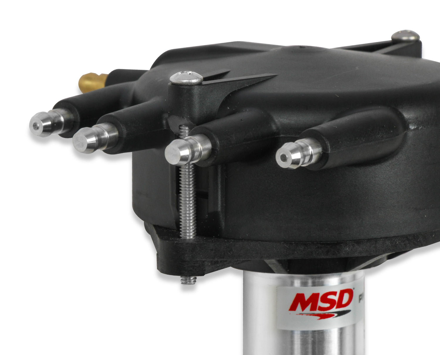 The MSD crab cap distributors are built specifically for racing engines with almost no room for a distributor due to tunnel rams or blowers. The distributor is equipped with a special low-profile crab style distributor cap to allow it to fit in extremely tight areas. The housing features two optional O-rings at the bottom that improve oil control by preventing oil pressure loss. Also, a small oil bleed hole located in the base sprays oil on the distributor and camshaft gears to prevent excessive wear. Since this is a racing distributor, there is an adjustable slip collar to make up for engines that have had the distance between the mounting surface and the gear modified. Crowning this distributor is MSD's own crab cap! This cap incorporates spark plug style terminals for a better connection and grip to the plug wires.