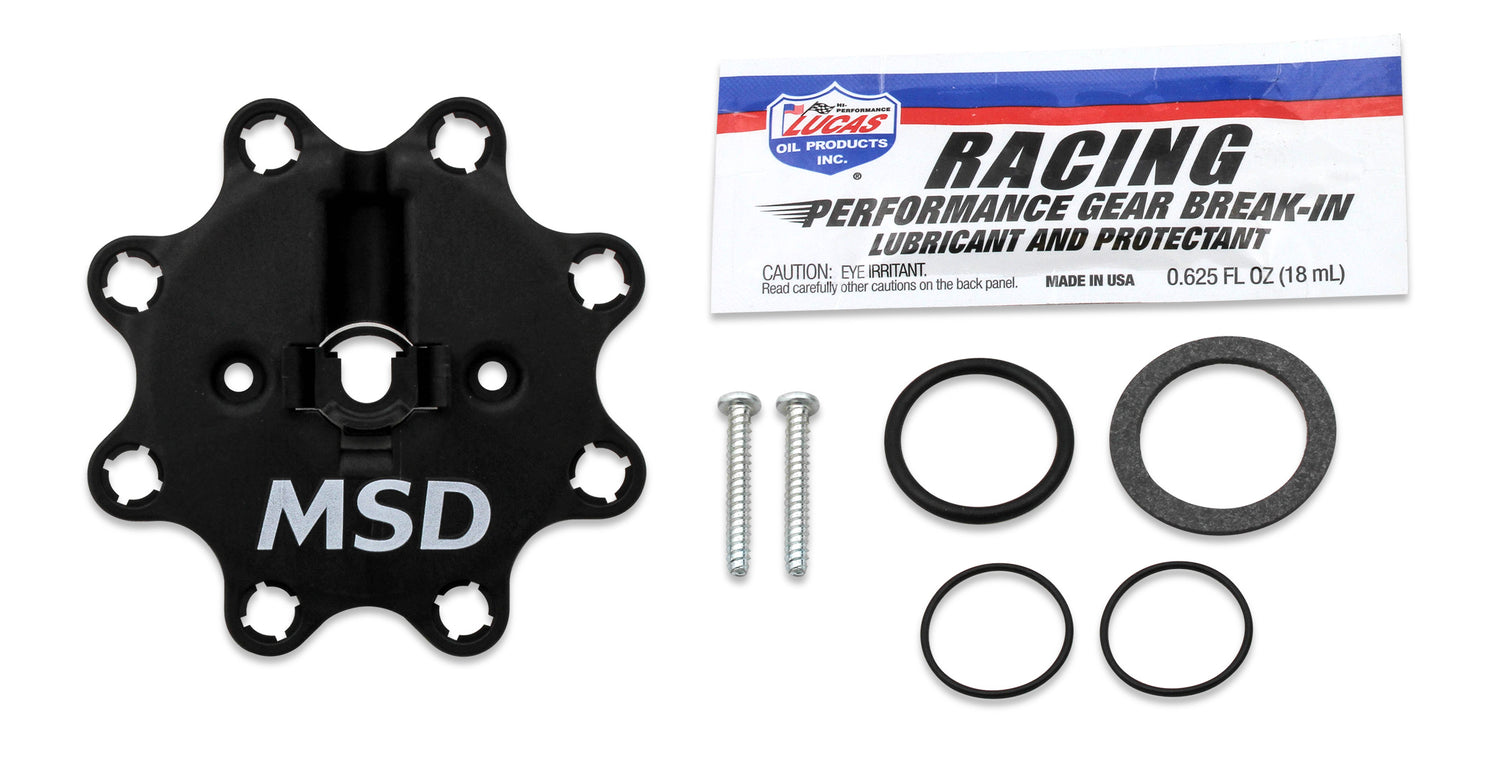 The unique design of these distributors fit tight intake systems while still transferring the high voltage of the MSD racing ignition to the spark plugs. The high voltage carrying capabilities are the result of several features which have been designed into these low-profile distributors. This includes a large diameter cap with wide spaced terminals and an injection molded Rynite rotor with thick vanes to stir up the air inside the cap. The high dielectric Rynite base also prevents arcing to the billet housing. The Tall Block Distributor has a unique slip collar design. This allows the PN 8558 to fit in most tall block engines that have had the deck height modified.