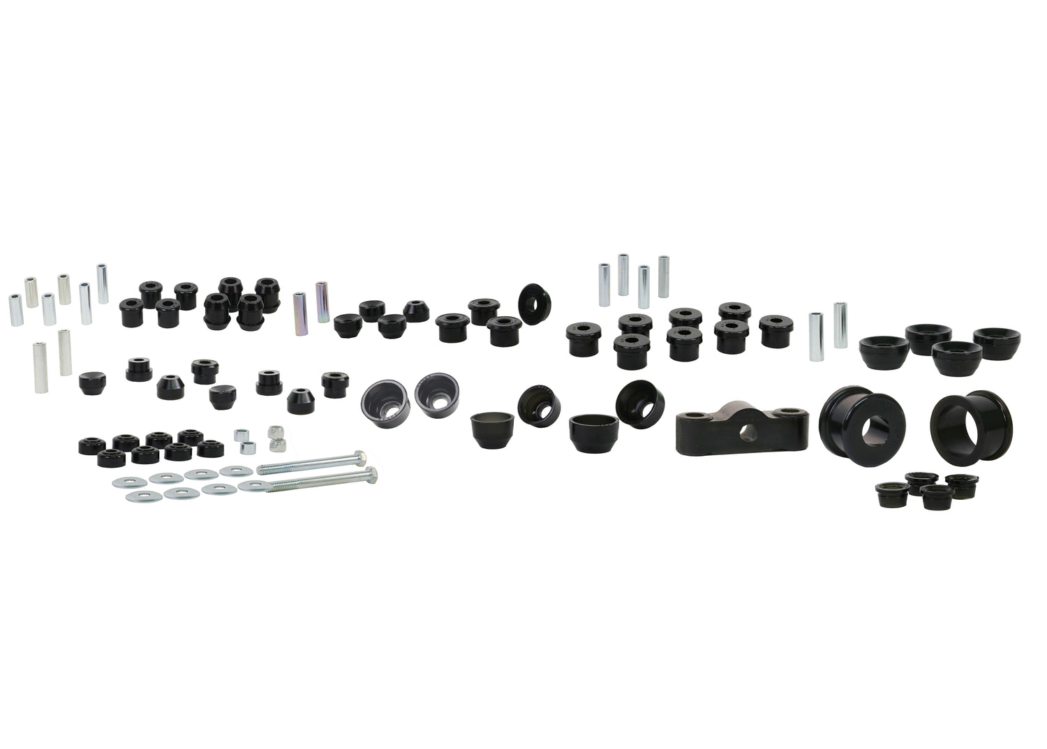 - Kit contains 57 Bushings, 18 Tubes, 2 Bolts, 8 Washers, 2 Nuts, Install Guide, Grease