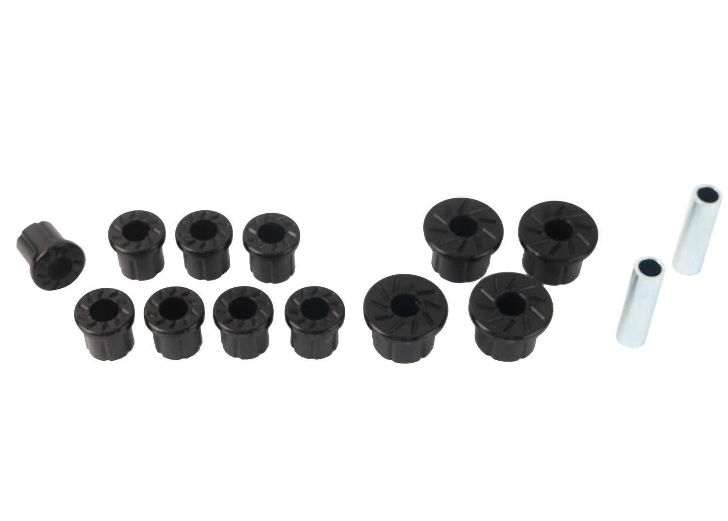 All in one leaf spring bushing service kit covering front and rear eyes of the leaf plus shackle bushings. High kilometres and heavy load carrying causes excessive wear on rubber bushings. Nolathane's signature black bushings are made tough and offer outstanding abrasion resistance, high load bearing capability (4WD's, utes and towing), flexibility, increased tensile strength and chemical resistance to oil, grease, ozone and weathering.