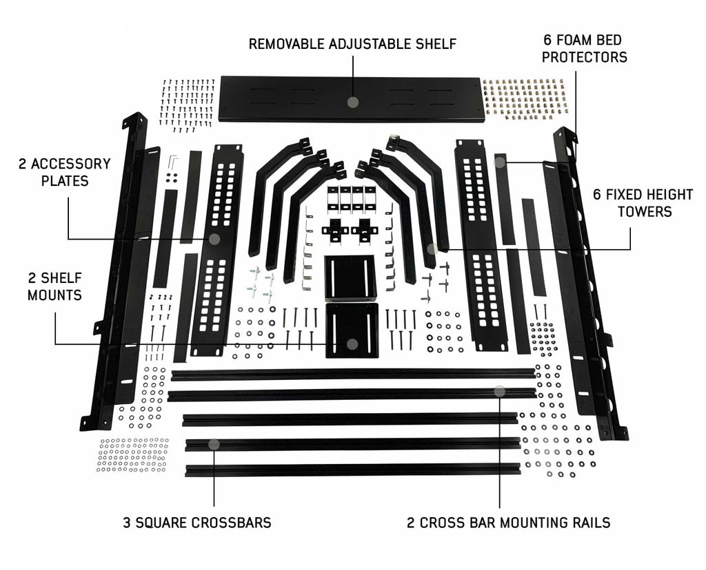 Universal fit mid-size truck application designed to be a no-holes to drill direct bolt on Truck Bed Rack. Featuring square tubing that can be set up to accommodate many mounting brackets, t-slots, and other cargo management gear to take on the trail.